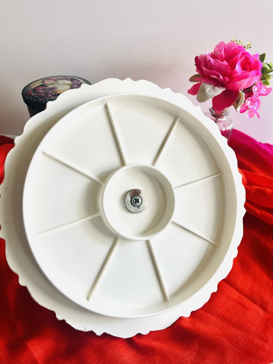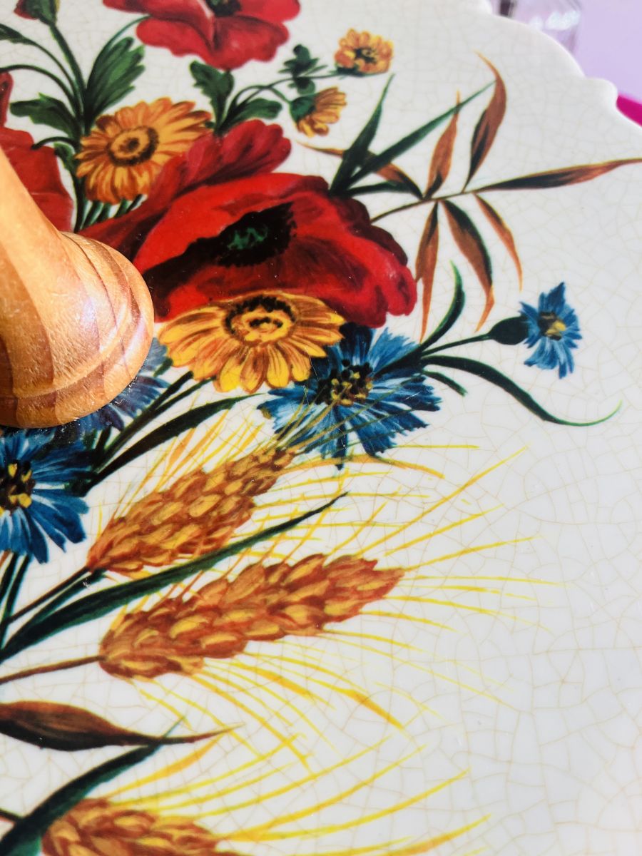 - [ ] Description ; Plateau à fromage avec motif floral. En mélamine, facile à nettoyer et typique des années 1970.