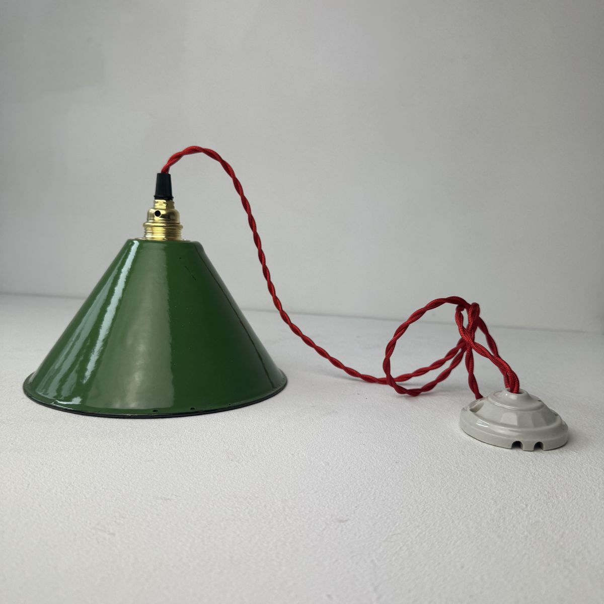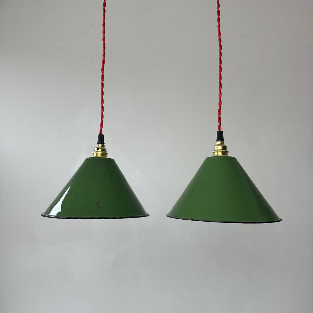 2 suspensions industrielles de forme conique en tôle émaillée verte. En bel état général. A noter quelques sauts d’émail et traces de rouille.