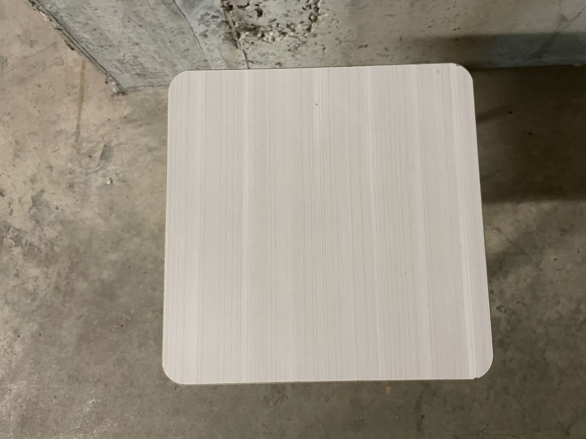 Tabouret en formica blanc des années 70, infimes traces d’usage, hauteur 45cm, assise 27x27cm, très bon état.