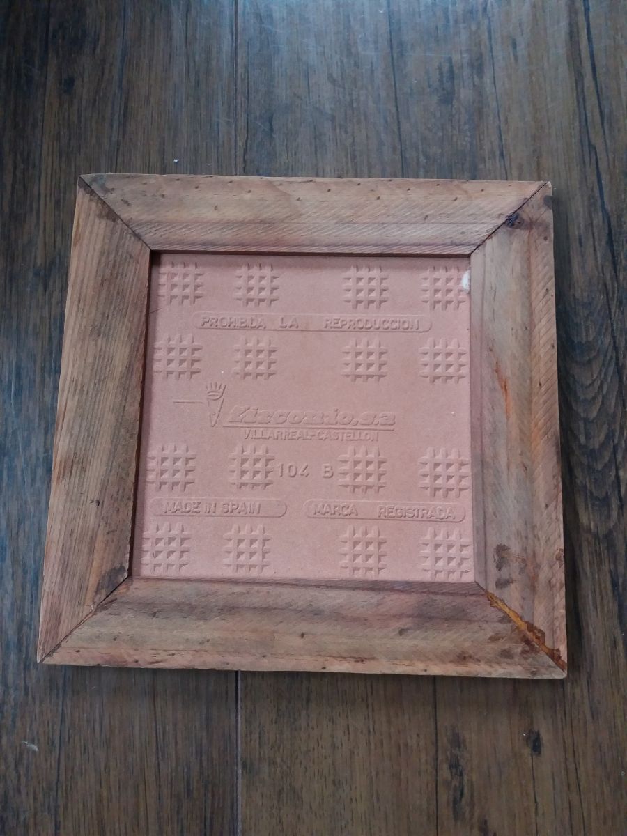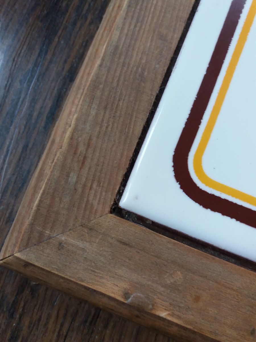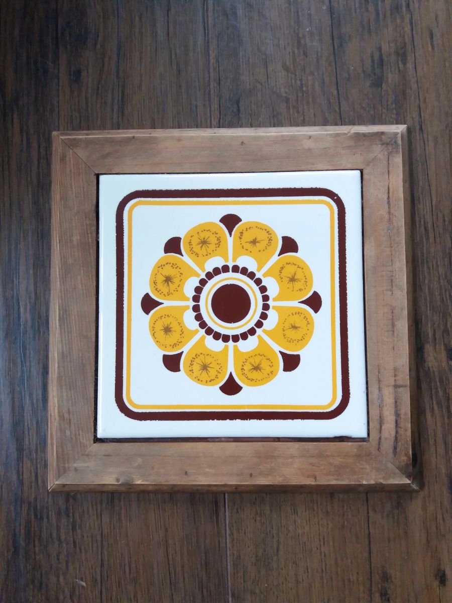 Charmant dessous de plat tout droit sorti des années 70 avec son décor de fleur et ses couleurs jaune et marron typiques de cette époque. C’est un carreau en céramique serti dans un cadre en bois. Au dos du carreau on peut lire diverses informations et notamment que cet objet, ou tout au moins le carreau de céramique, est de fabrication espagnole, par l’entreprise Zirconio. L’ensemble est en bon état général, cadre solide, motif bien visible avec des couleurs très vives, mais ne cache pas son âge et des marques d’usages : des marques diverses sur le bois, notamment des brûlures, un petit manque sur le coté du carreau mais d’origine car on voit une coulure d’émaillage sur le manque. C’était peut-être une manière de « recycler » les carreaux avec un petit défaut qui n’était pas utilisables pour carreler un mur...plutôt que de les mettre au rebut comme on le ferait aujourd’hui, malin si c’est le cas ! Sur le carreau, quelques micro-rayures et petites abrasions quasiment invisibles (on ne les distingue qu’en tenant le carreau sous un certain angle par rapport à la lumière et au regard). Le dessous de plat mesure 21, 2 cm de côté pour une épaisseur de 1, 1 cm.