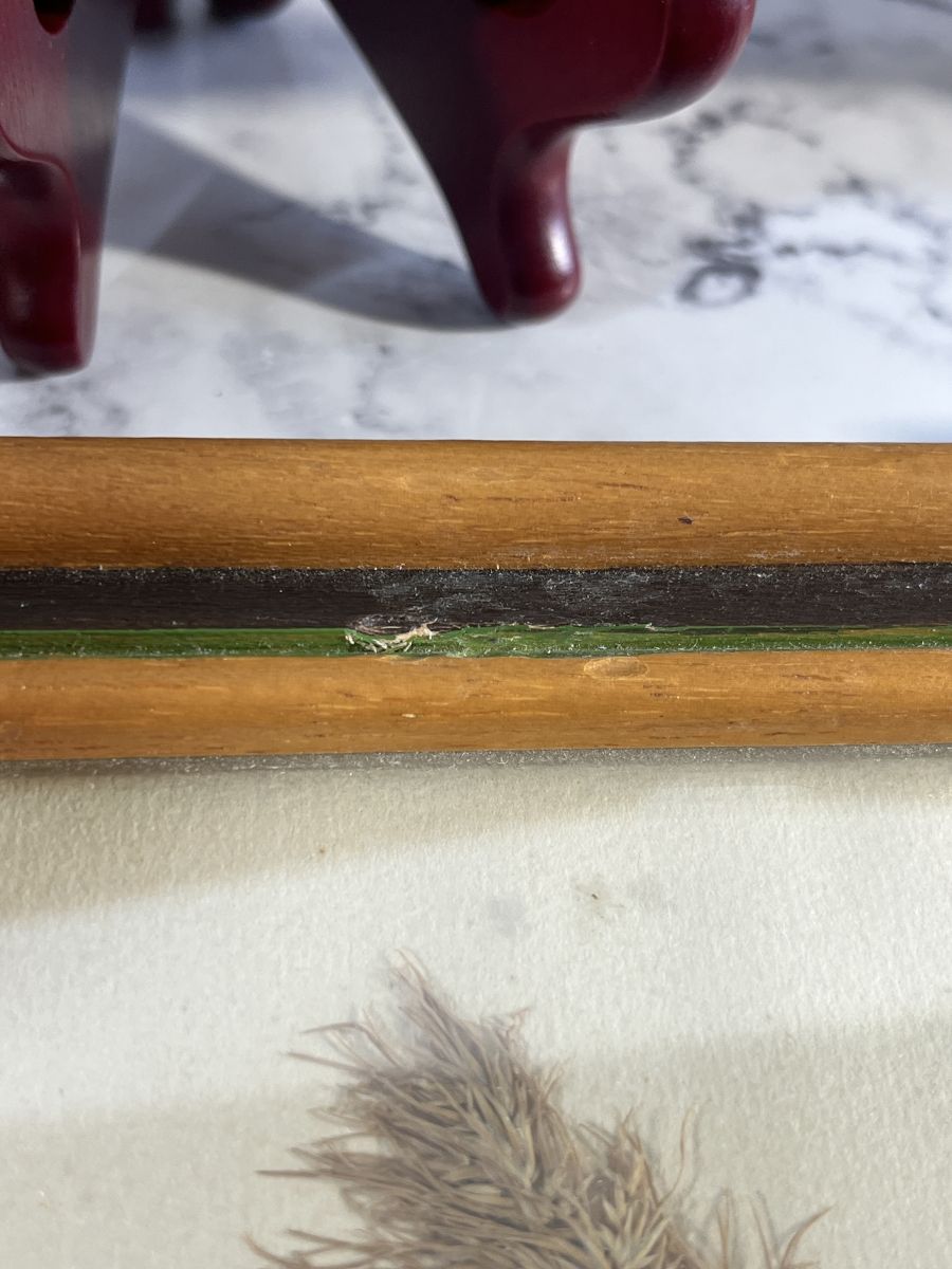 Il y a deux cadres qui ont deux petites impacts sur le contour interne voir les photos et un des cadres comportes une feuille ou les bouts sont abimés.