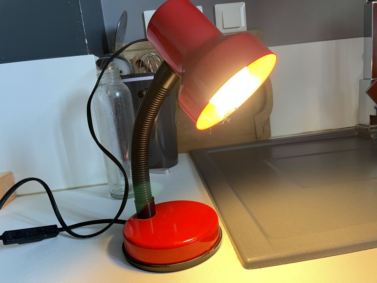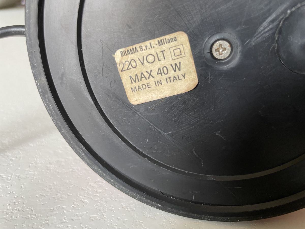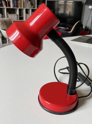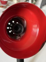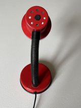 Lampe de bureau rouge à poser des années 80 de la marque italienne Brama Milano, métal et plastique, tige flexible et réglable, ampoule vissée de type e14, quelques points d’usure (notamment à l’intérieur de l’abat-jour-voir photos), hauteur 28cm, diamètre abat-jour 9cm, diamètre socle 12cm.