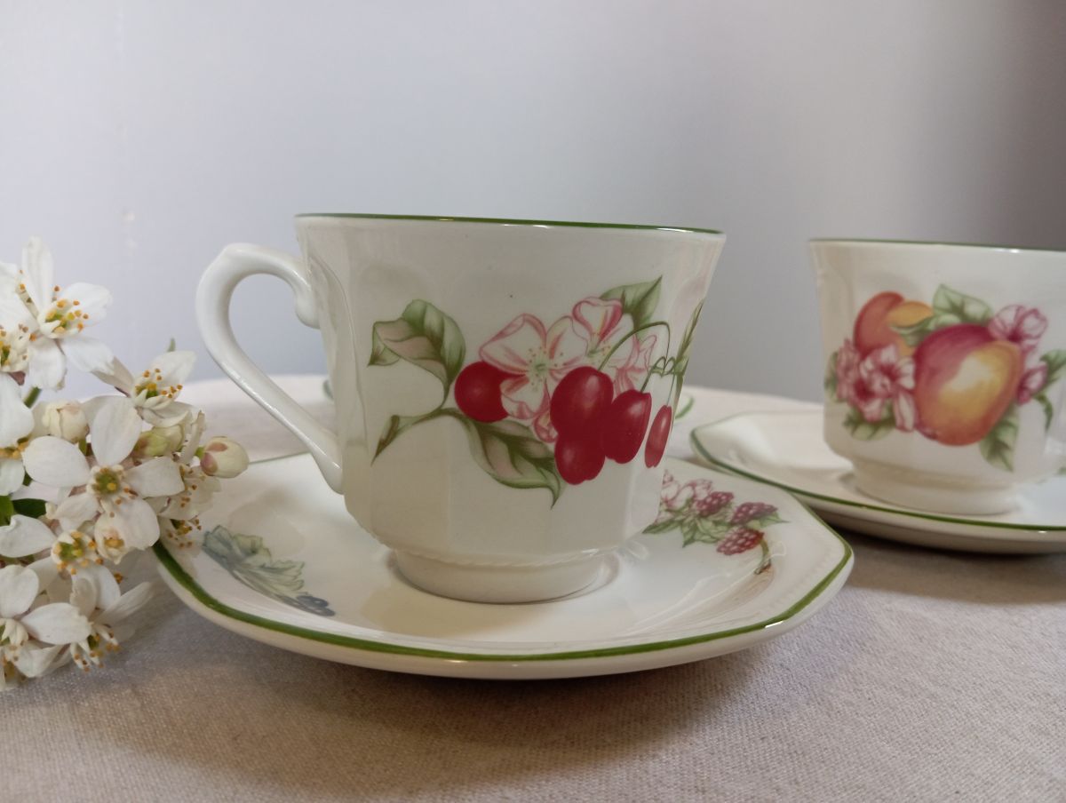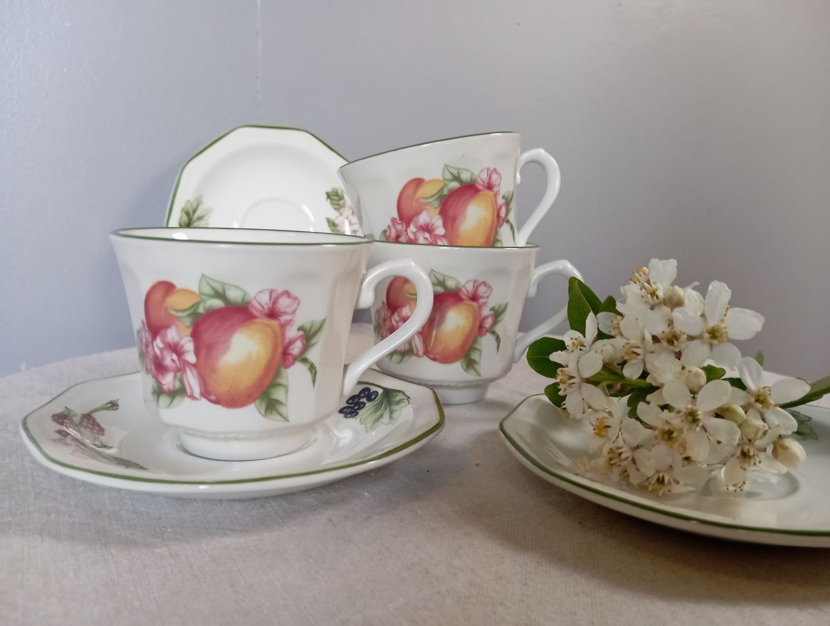 Très joli ensemble vintage composé de 3 tasses à thé et leur sous-tasse en porcelaine blanche au magnifique décor de fruits (modèle Victorian orchard ou verger victorien) avec liseré vert sur les contours, et soucoupe de forme Victoria Orchard décagonale. la Manufacture Anglaise Churchill.