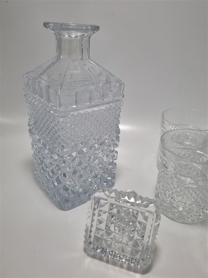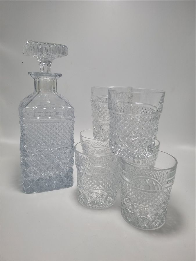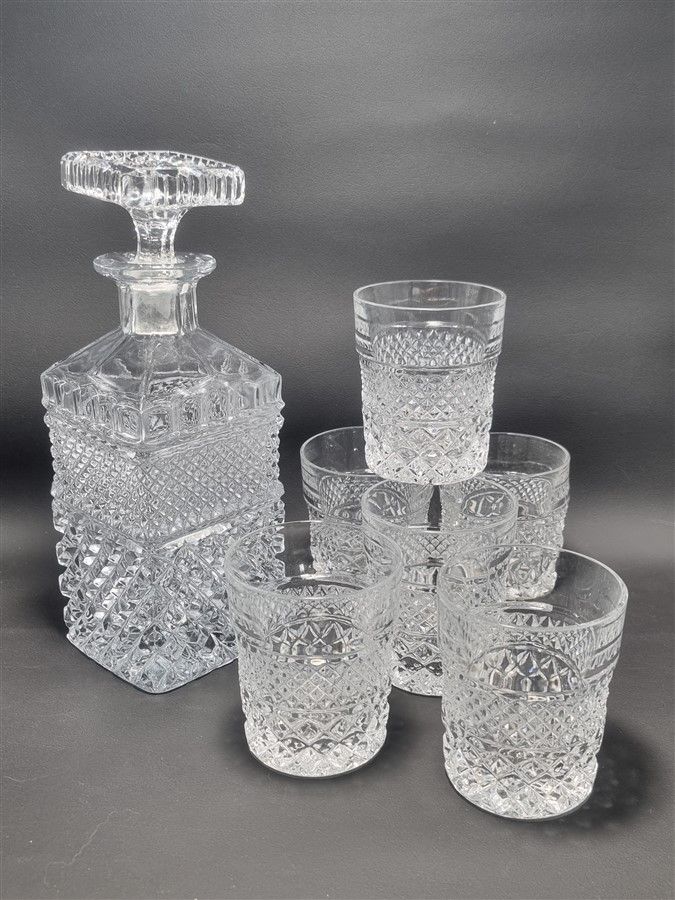 Service à whisky composé d’une carafe et de 6 verres, un des verres est un peu différent des autres, voir photo.