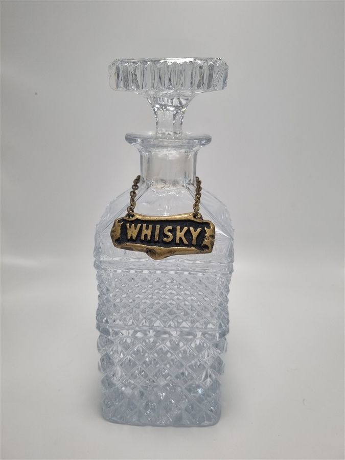 Une petite déco en laiton avec l'inscription "whisky" à glisser au col de la carafe.