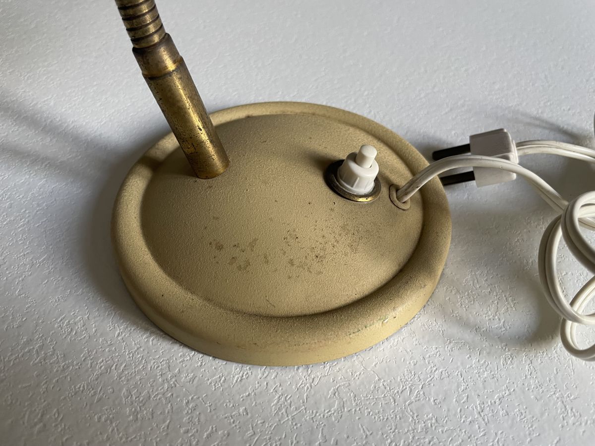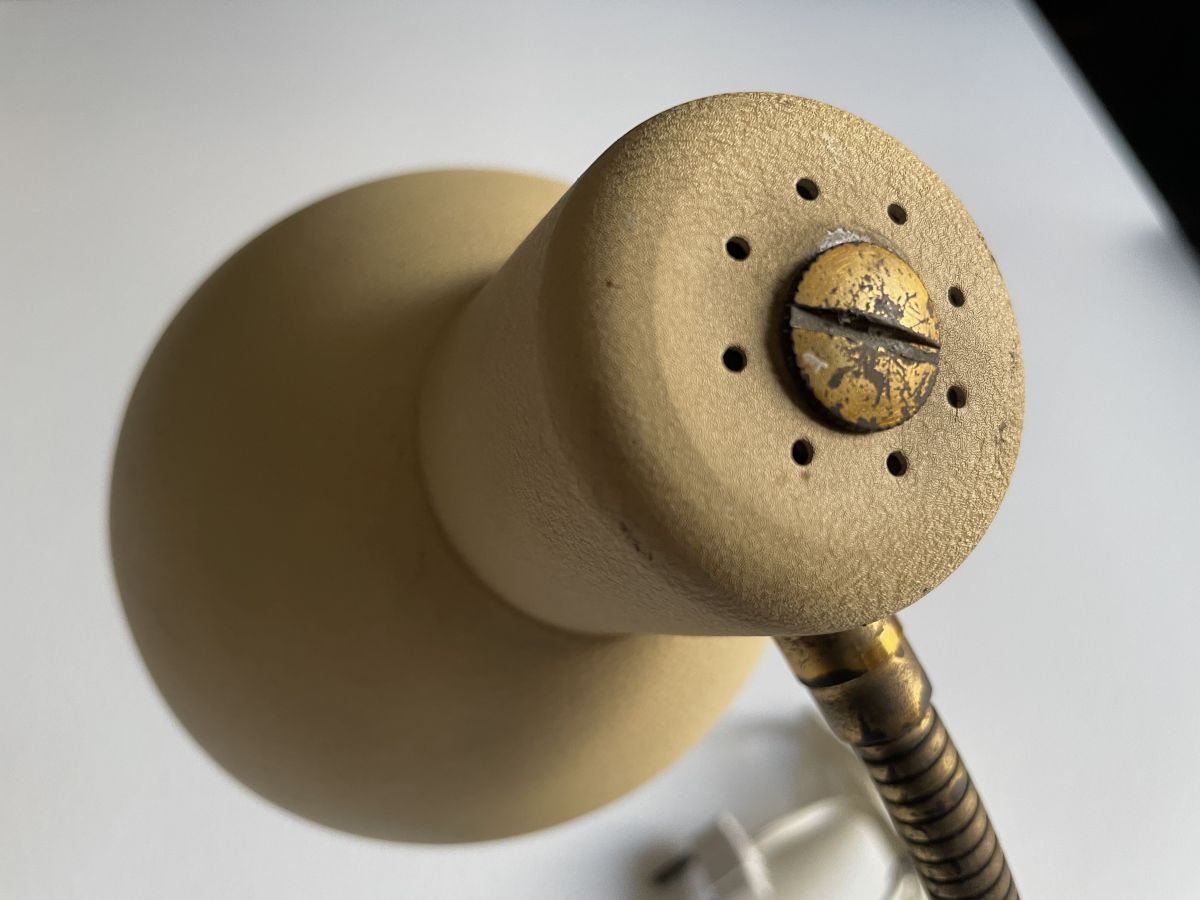 Petite lampe cocotte en métal beige sablé et tige flexible en métal doré des années 50, hauteur 30cm, diamètre de la base 12cm, diamètre de l’abat-jour 12cm, quelques traces d’usage normal, ampoule baïonnette, en parfait état de fonctionnement, bon état général.
