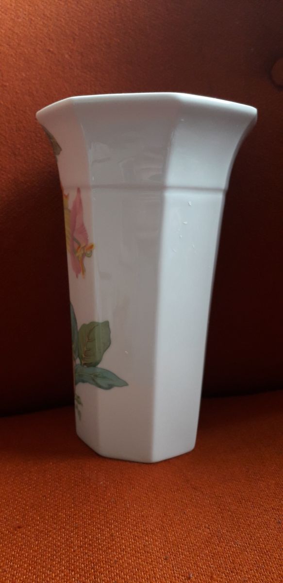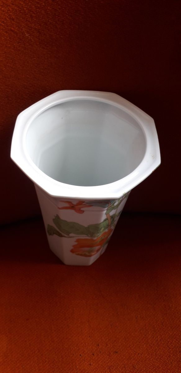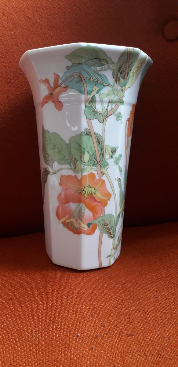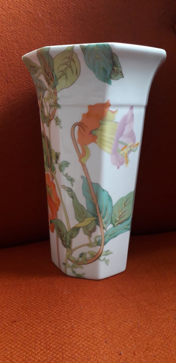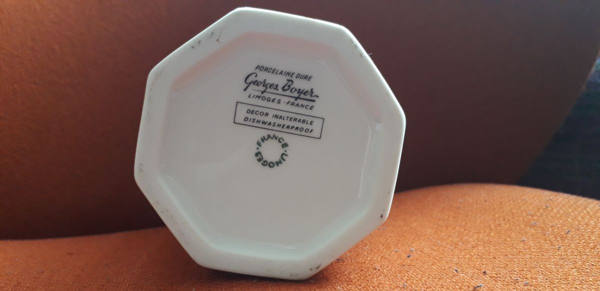 Vase vintage en porcelaine de Limoges signé George Boyer. Le vase est de forme évasée et octogonale avec un décor floral raffiné. Le vase a un bel effet de couleurs.
