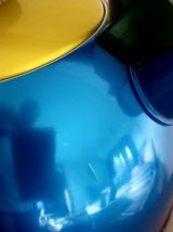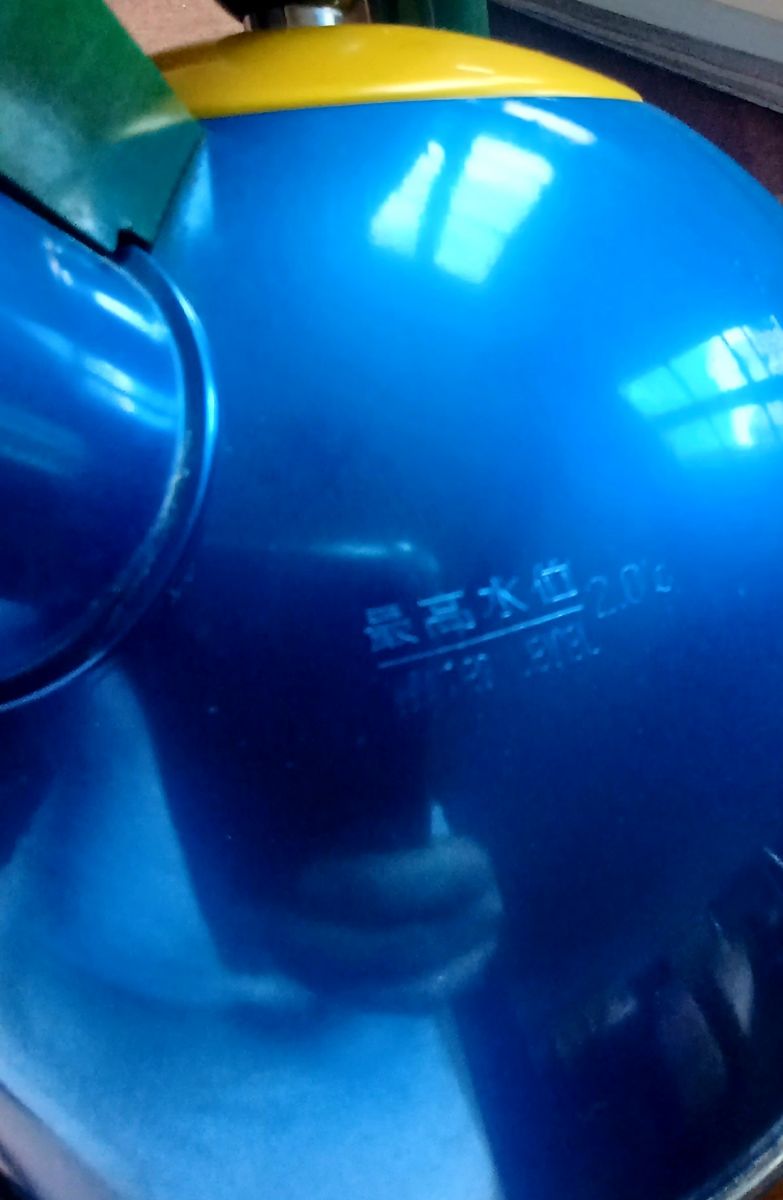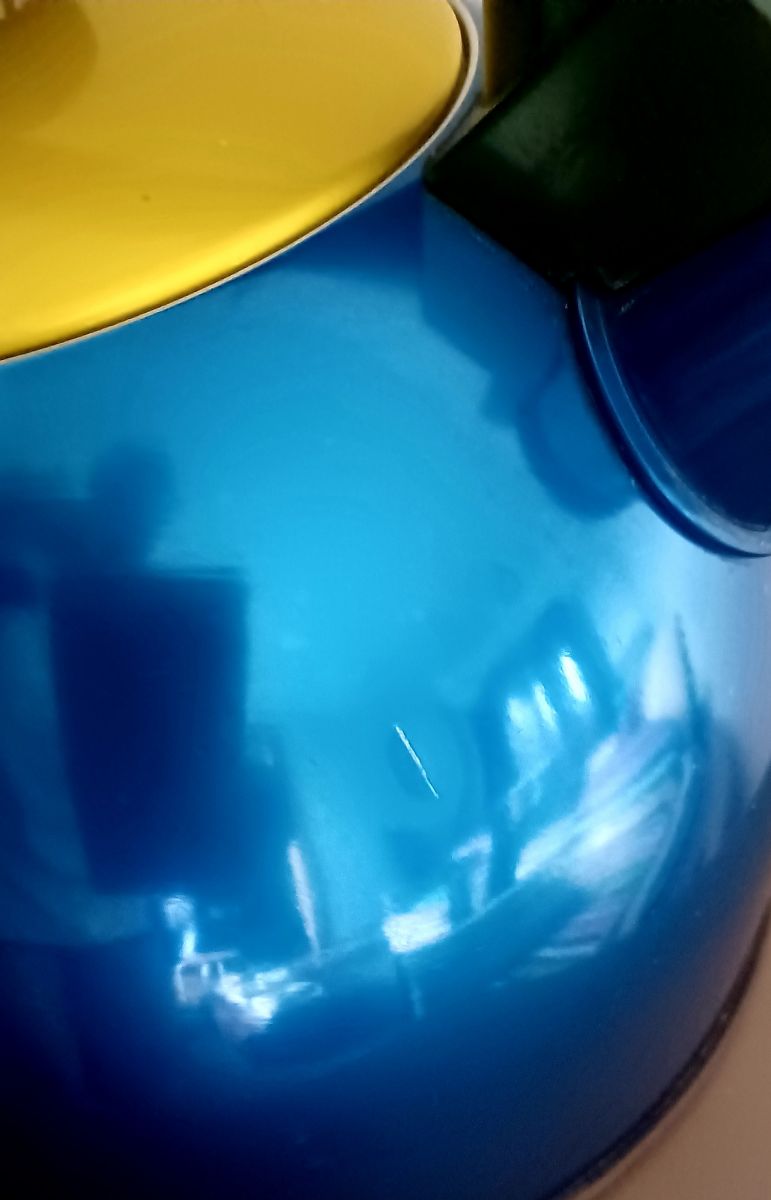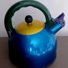 CookVessel est connu pour ses fournitures de thé en aluminium. Bouilloure bleu métallisé et couvercle jaune moutarde. Bouchon violet et poignée verte.