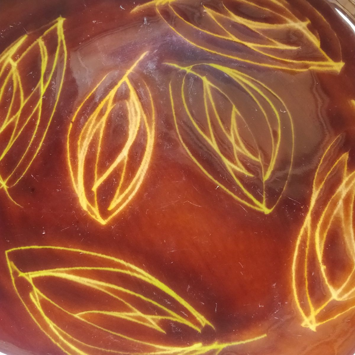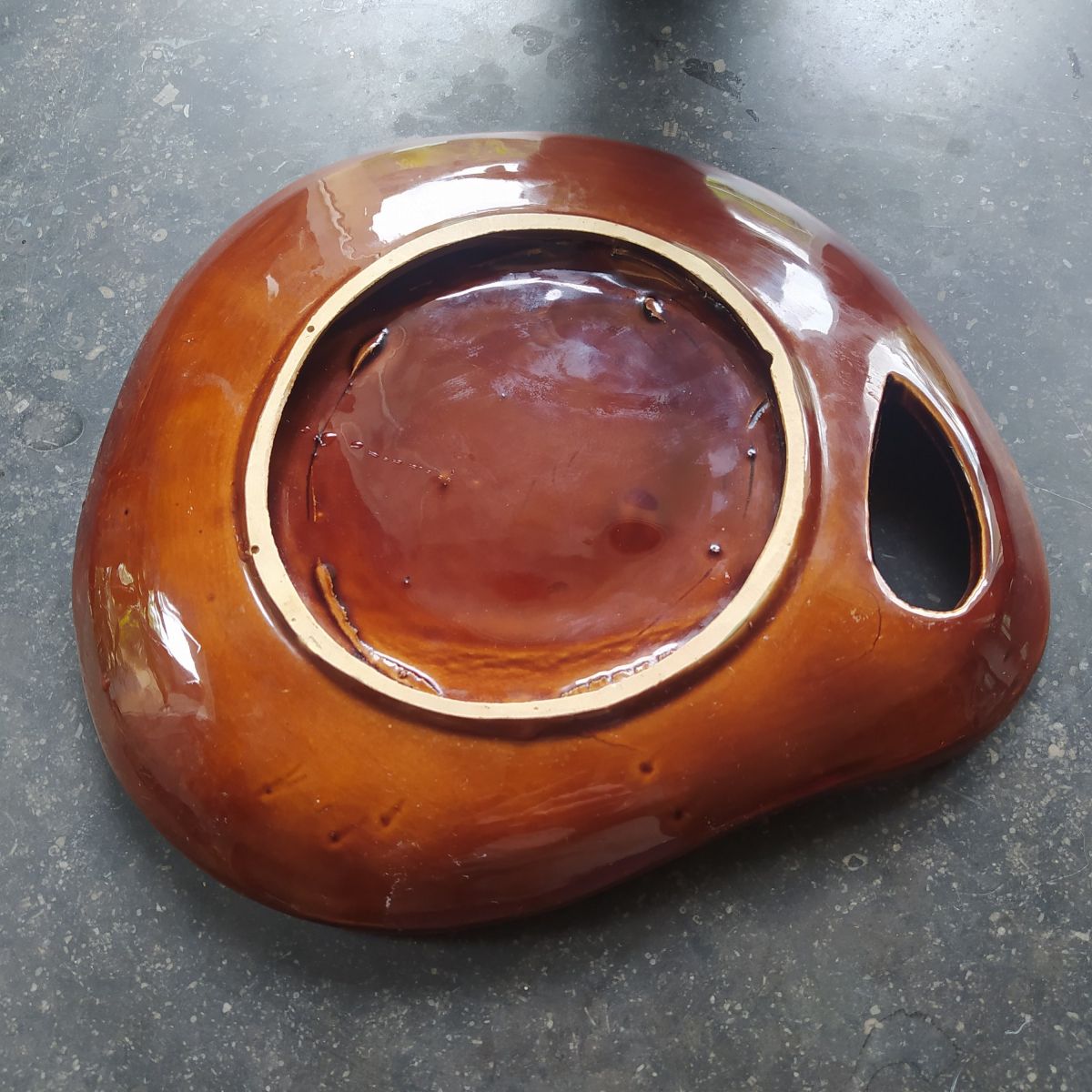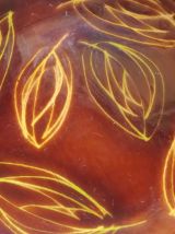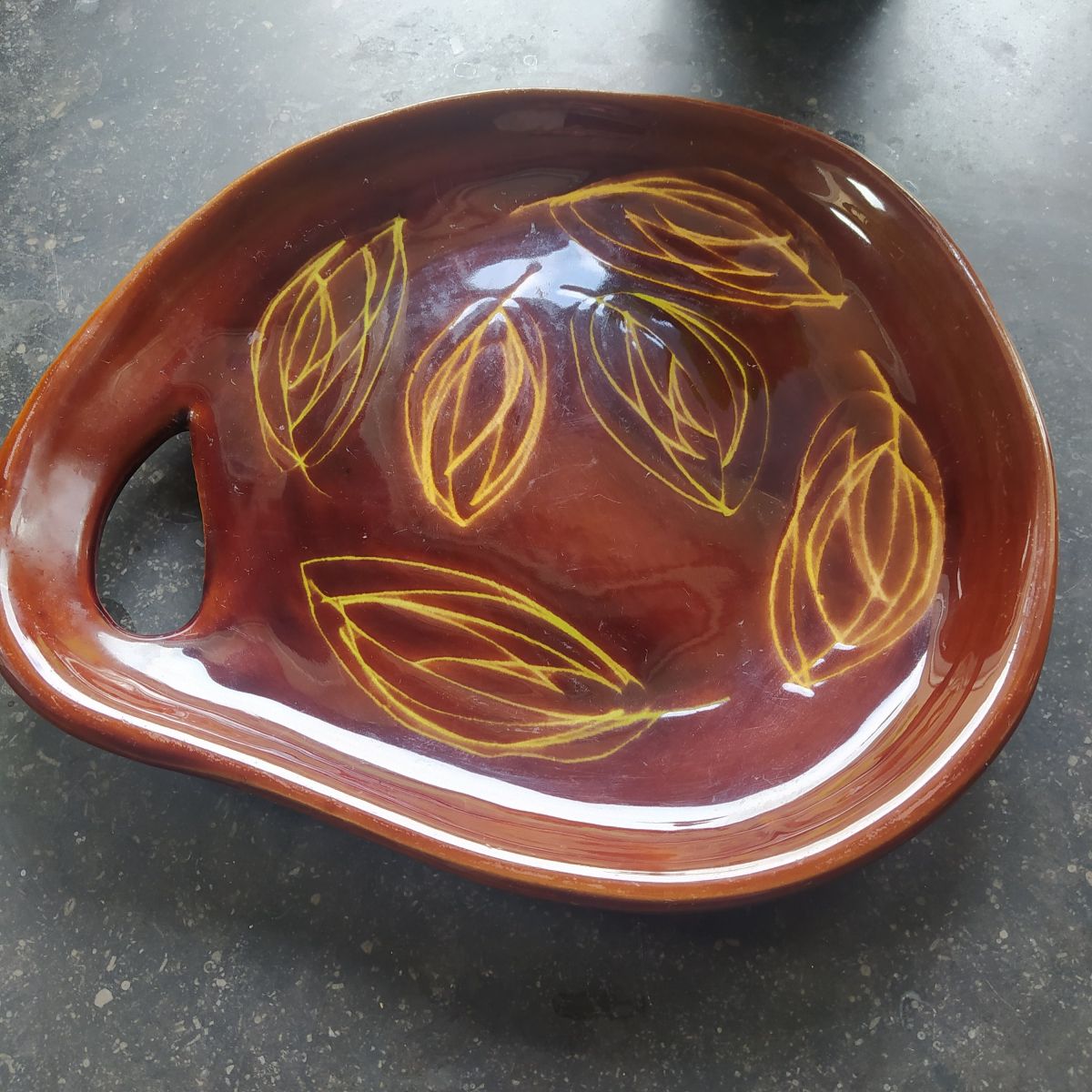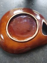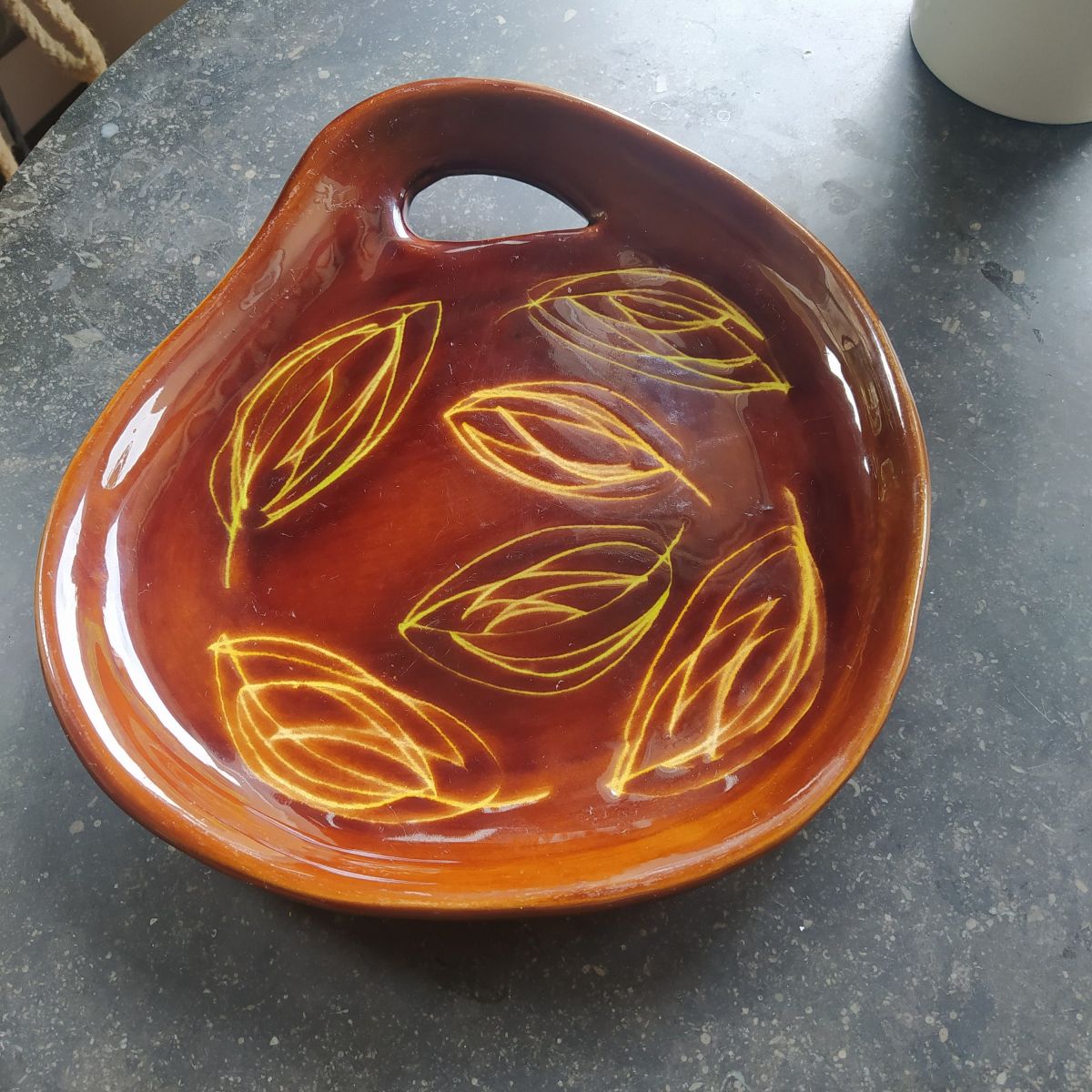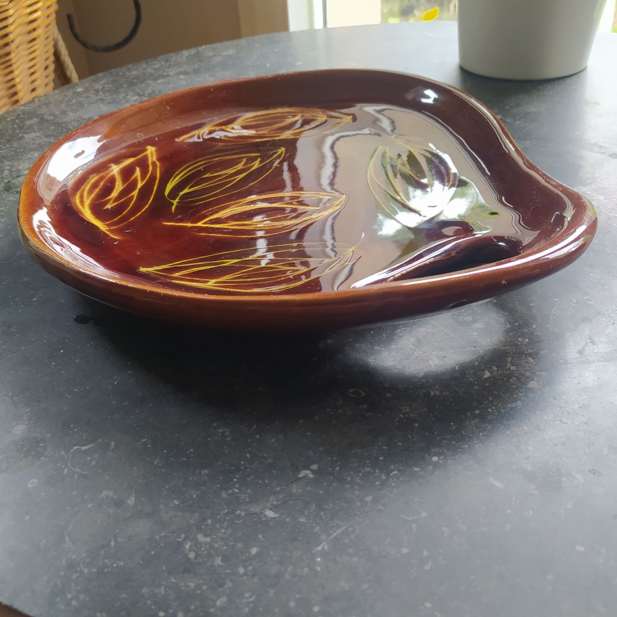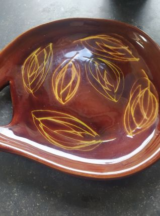 assiette de présentation pour apéritif vintage des années 70 en céramique marron avec jolis motifs de feuilles