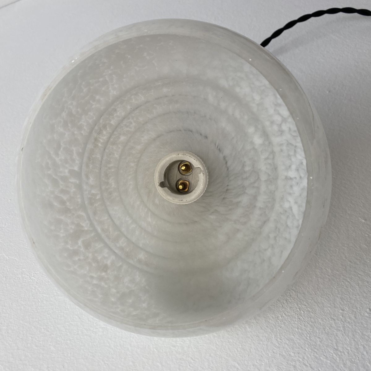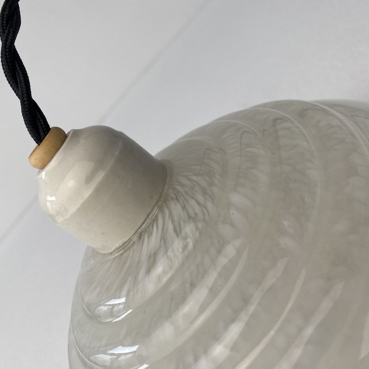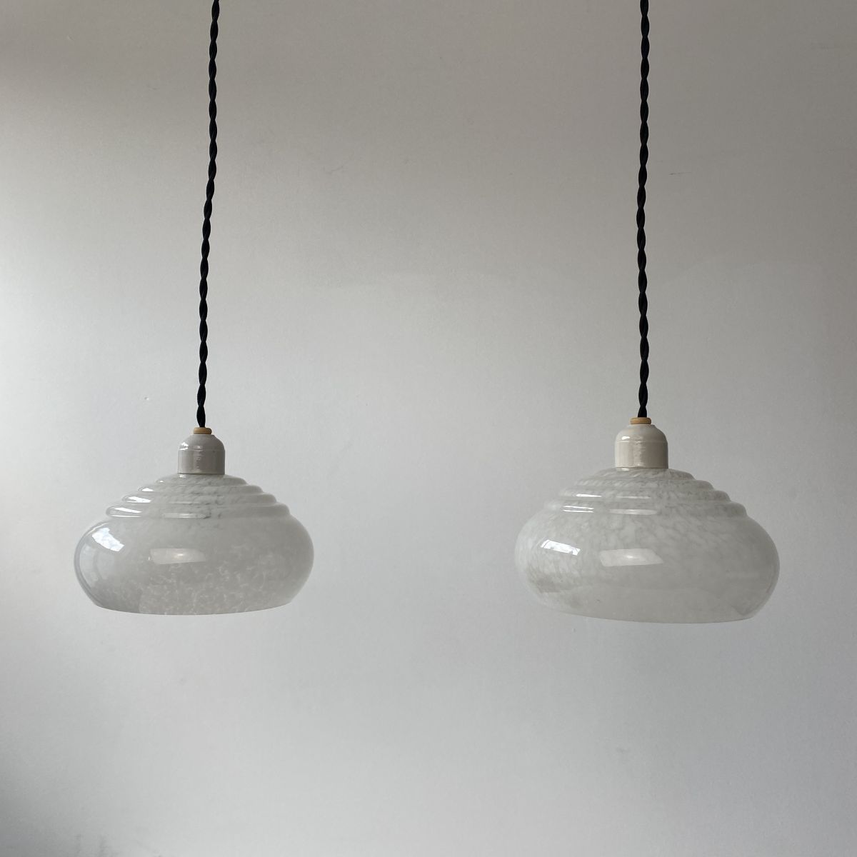 2 petites suspensions blanches en verre de Clichy des années 1950. Lumière tout en douceur. En bel état.