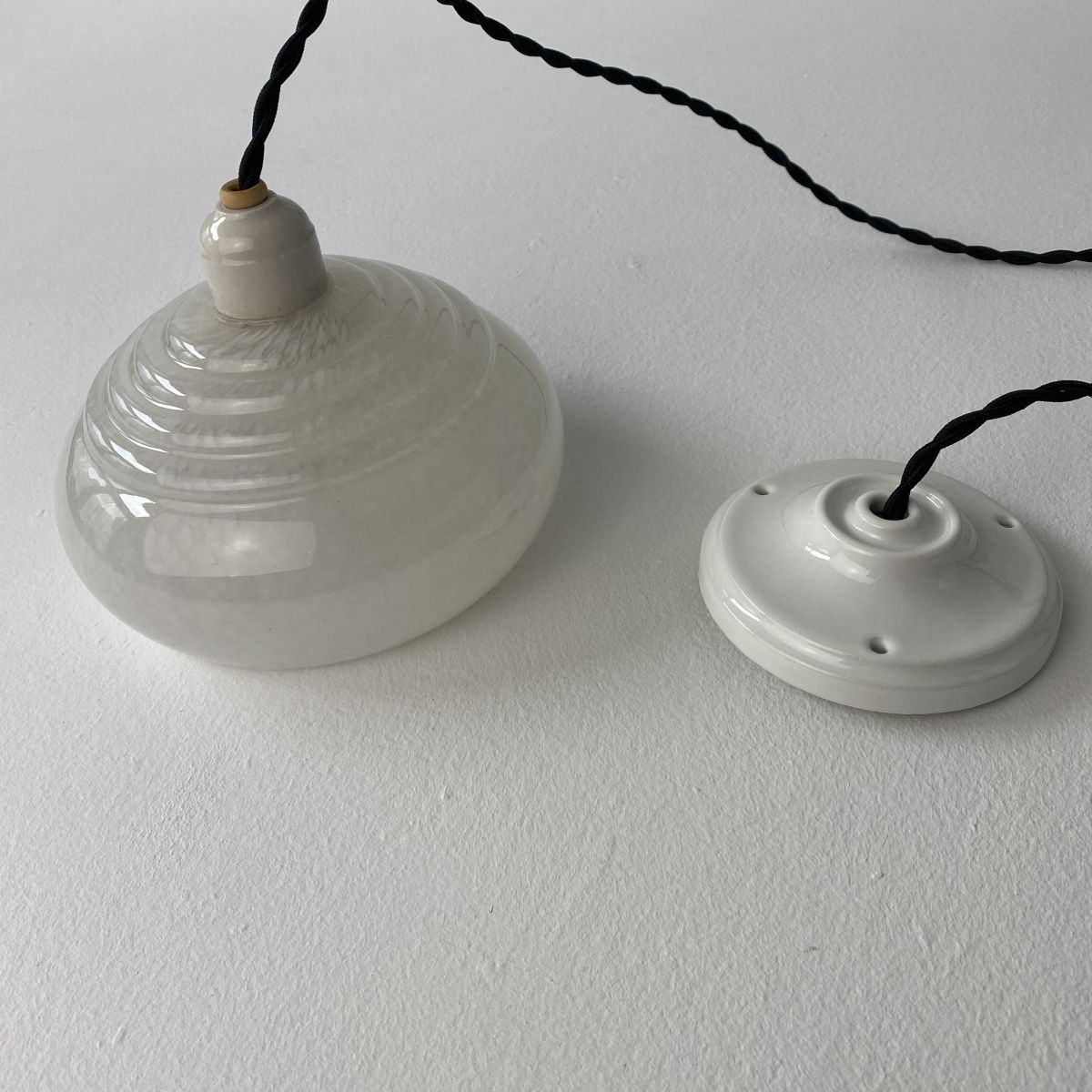 Electricité refaite à neuf avec fil noir en tissu tressé. Prête à brancher par domino. Douille à baïonnette en céramique (ampoule E27 et passe-fil en buis. Rosace en porcelaine pour accroche au plafond.