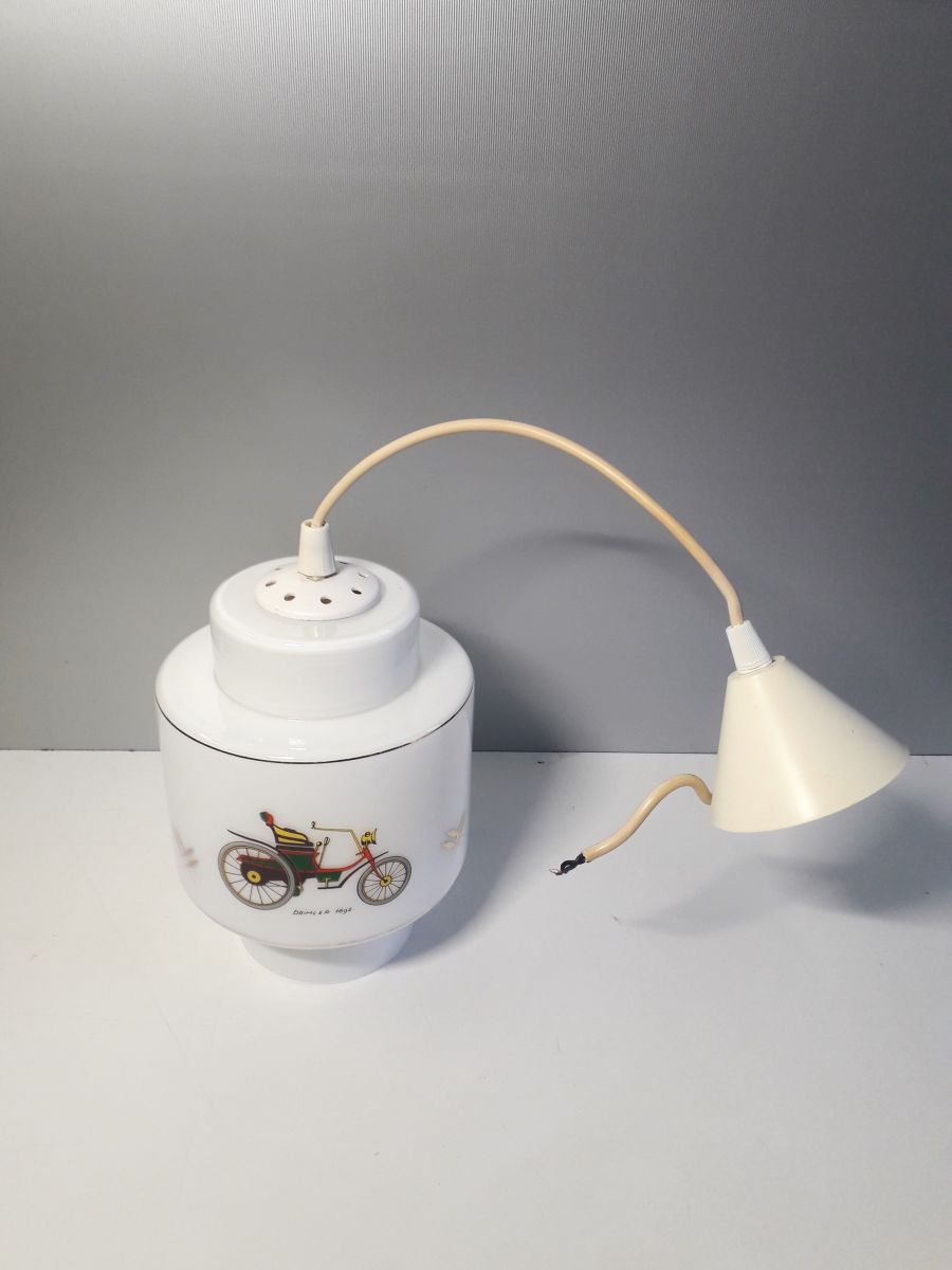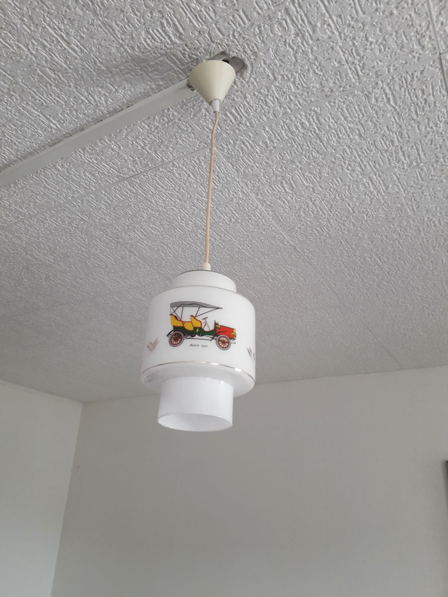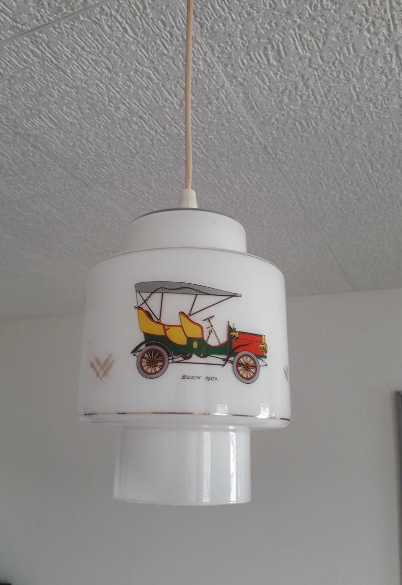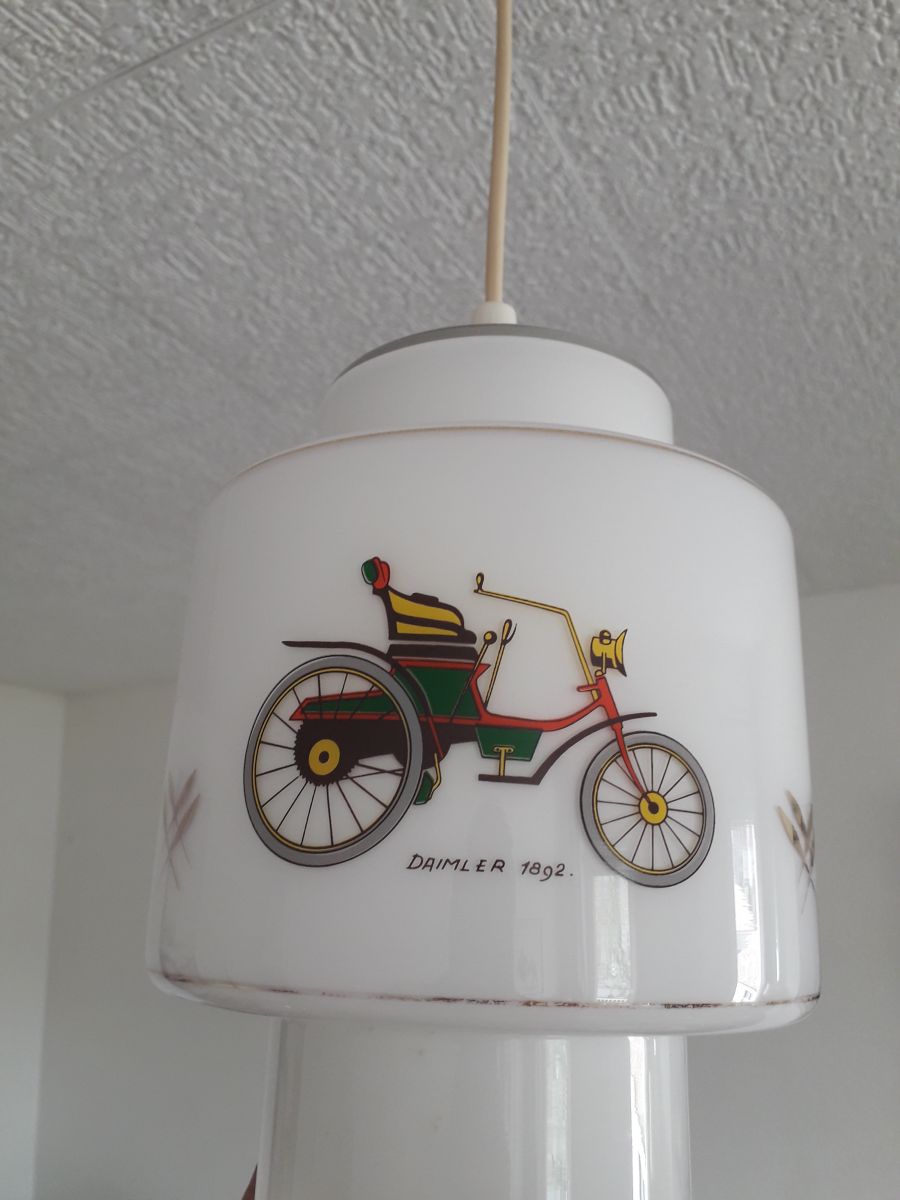 Jolie suspension en verre blanc sérigraphié d'automobiles du début du siècle .