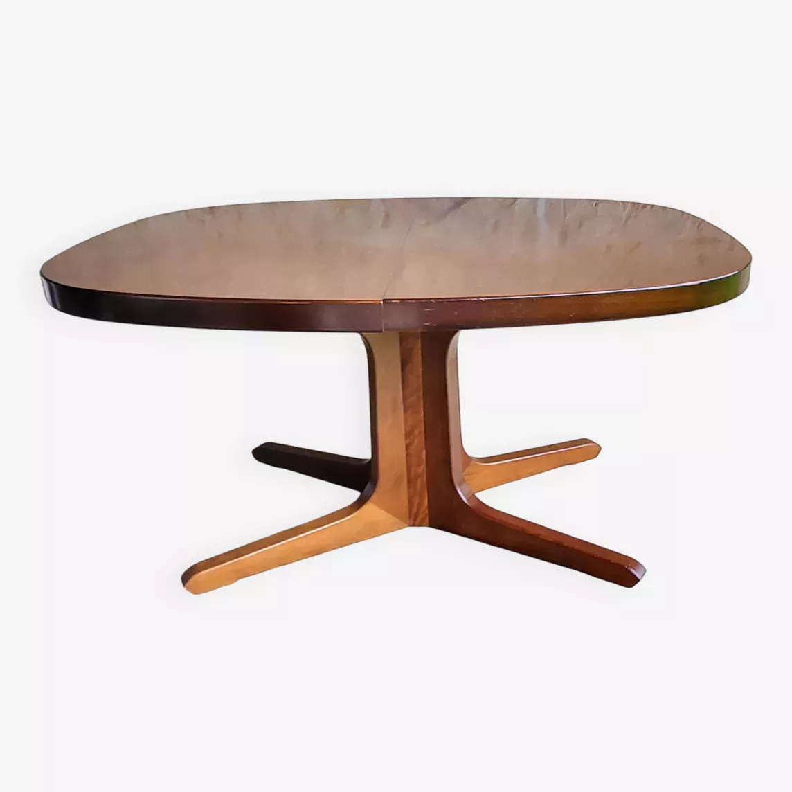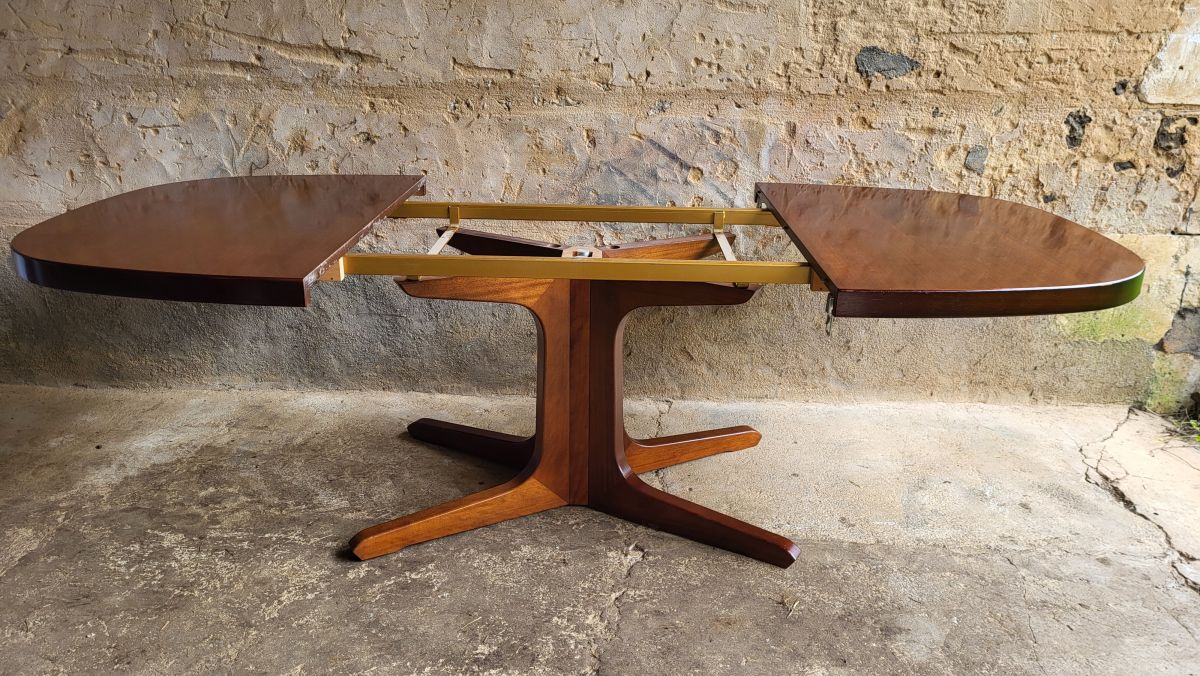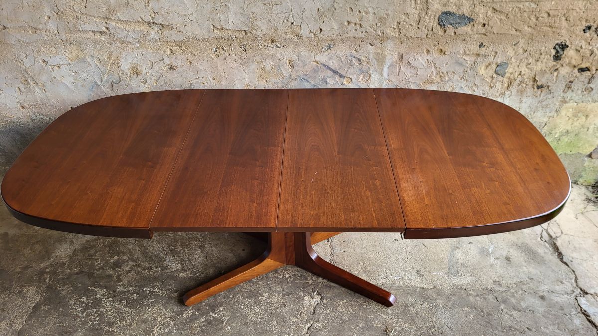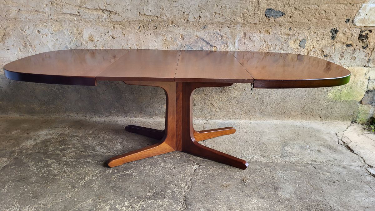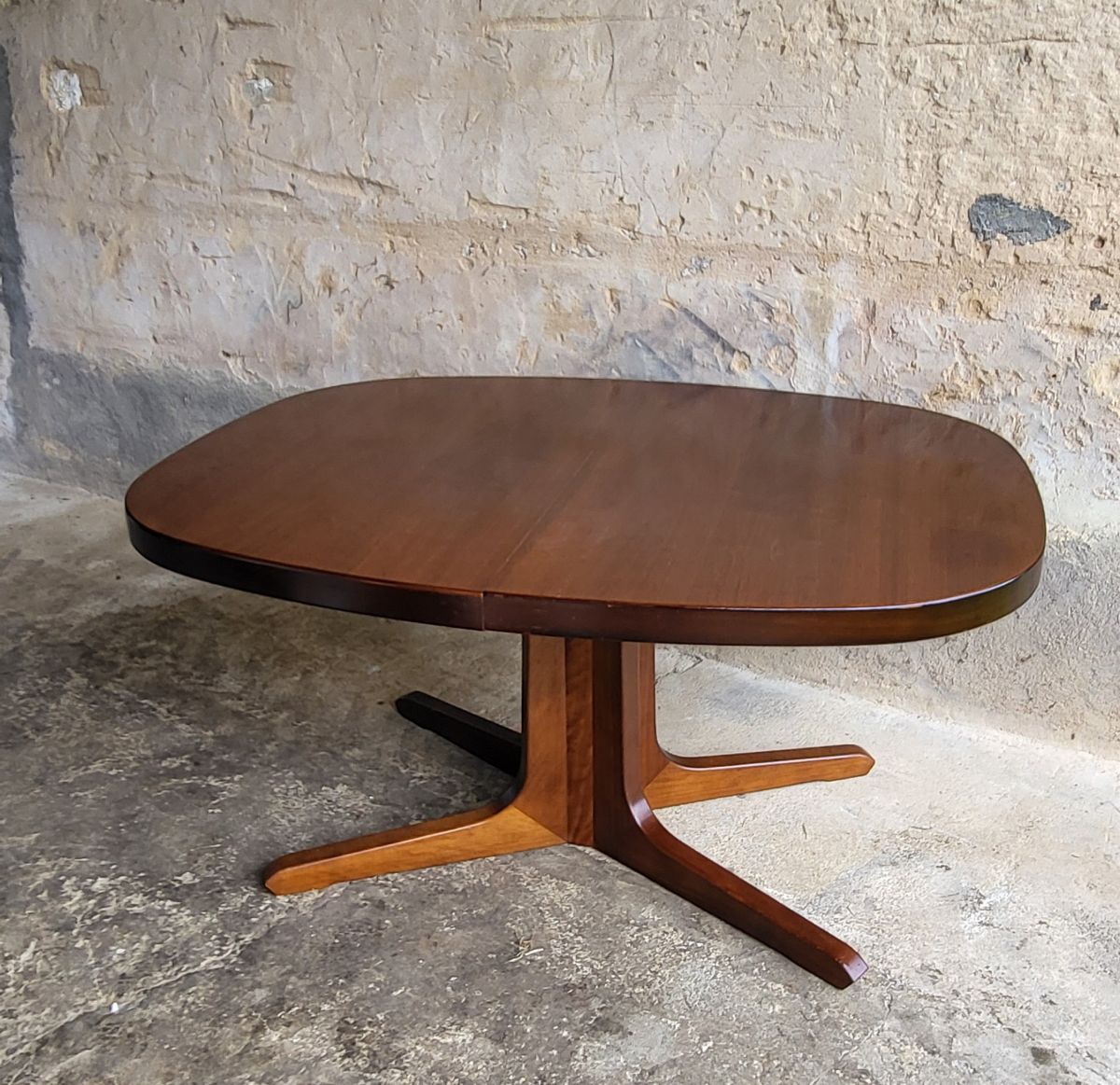 Table à manger de style scandinave / baumann années 60 possédant 2 rallonges.la table est d'allure ovale (dimensions 108, 5*140 cm). Les rallonges mesurent 45 cm chacune. La table peut contenir au total 12 convives. Elle est en bon état. Allonger la table ne pose aucune difficulté. Elle est globalement en bon état avec traces d'usage et d'ancienneté habituelles. La petite tache sur l'arrête droite du bandeau n'est pas un accident. Le bois est simplement de couleur différente à cet endroit. Hauteur 73 cm. Hauteur 73 cm. Dimensions avec rallonge 108, 5* 230 cm.