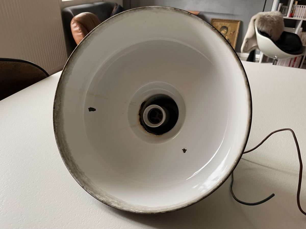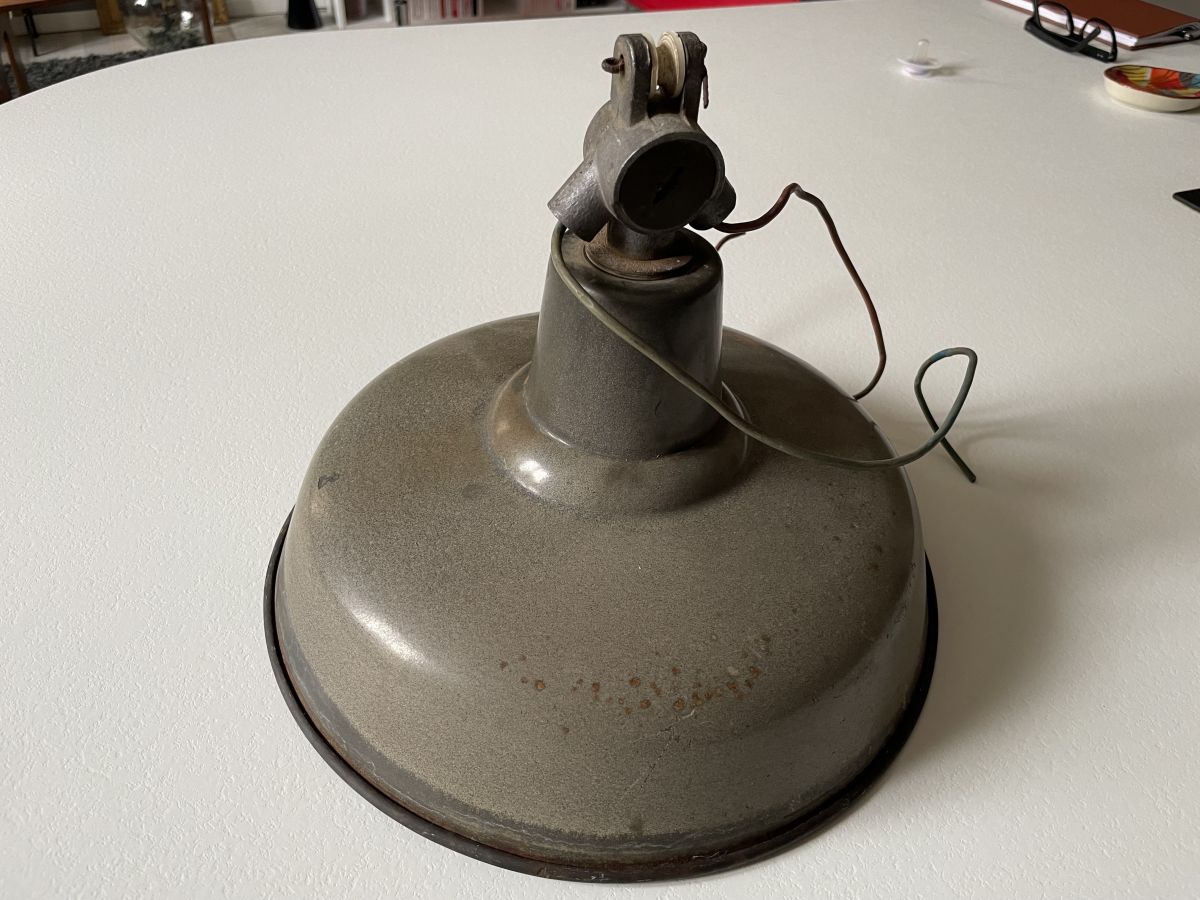 Suspension d’usine gamelle des années 50, émaillée grise, quelques légères oxydations, diamètre 30cm, hauteur 24cm, ampoule à vis type E27, fonctionne parfaitement, bon état.
