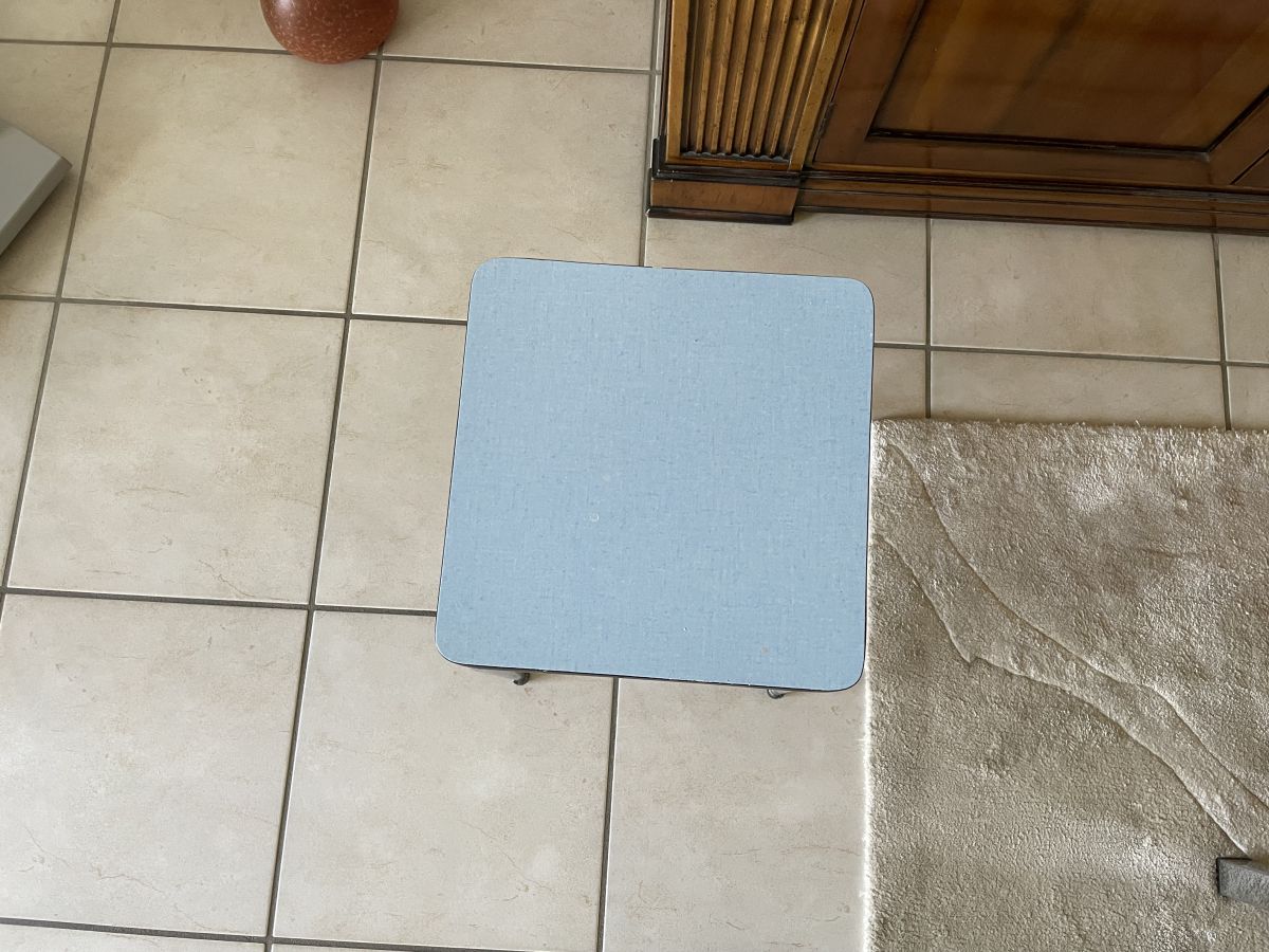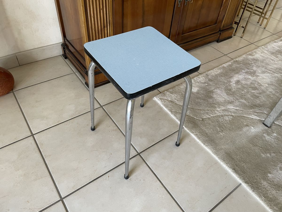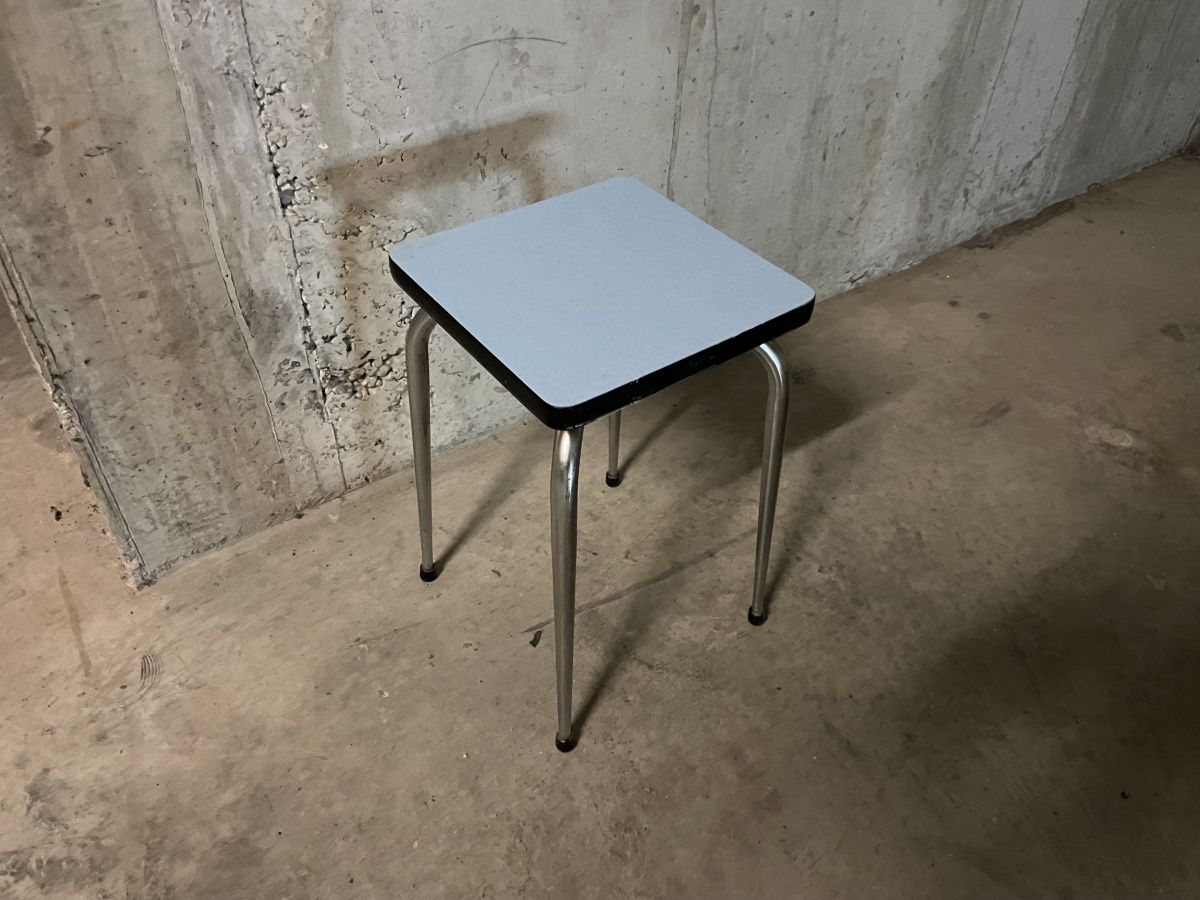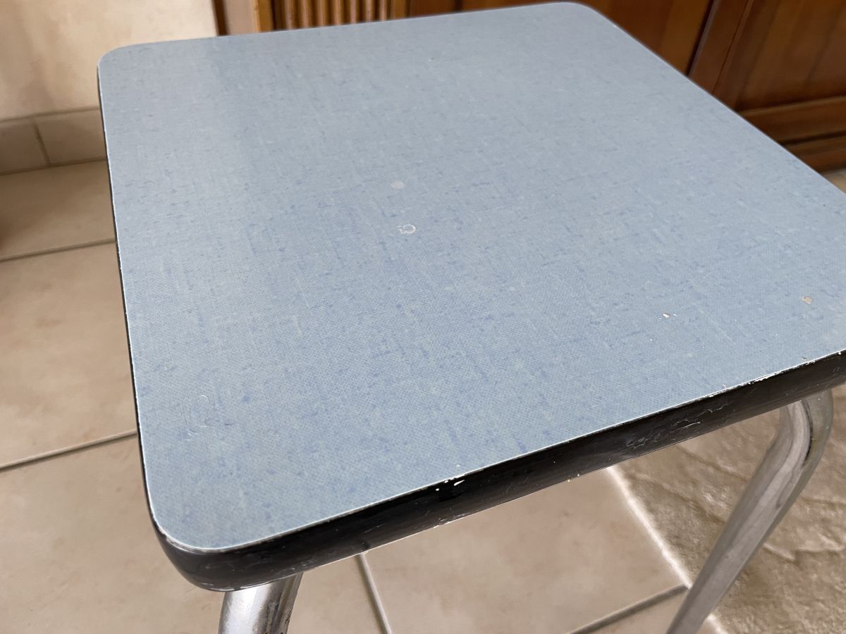 Tabouret en formica bleu des années 70, traces d’usage, hauteur 44cm, assise 28x28cm.