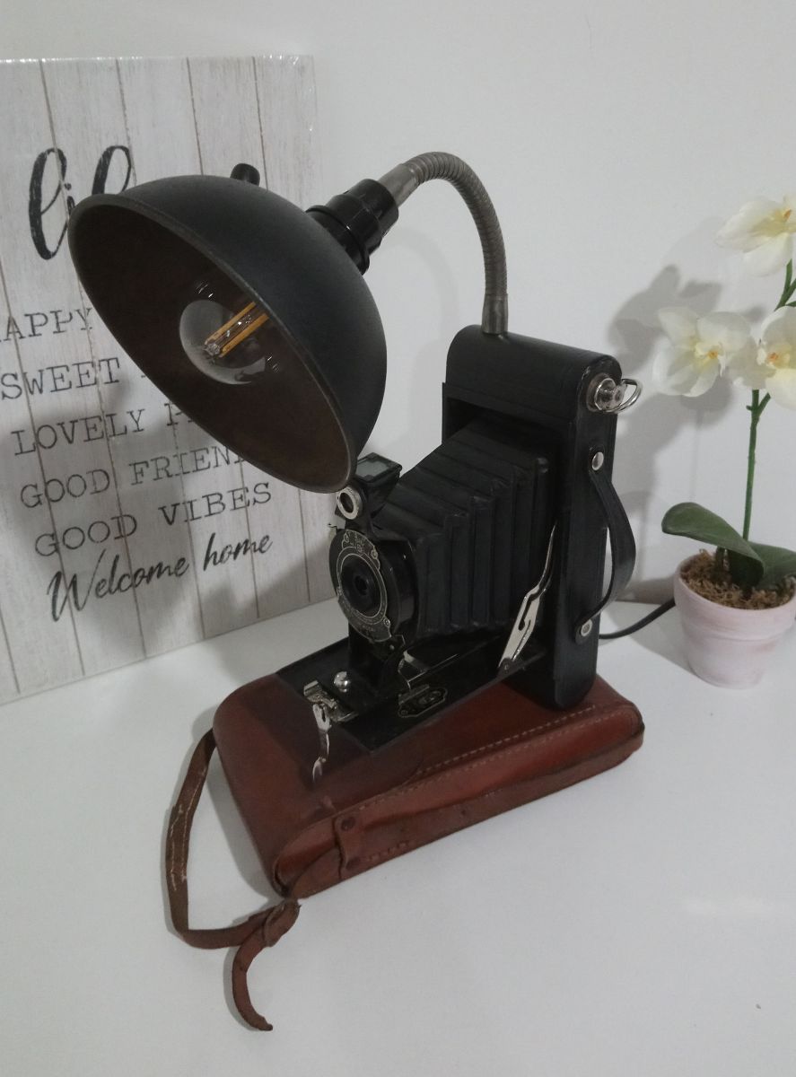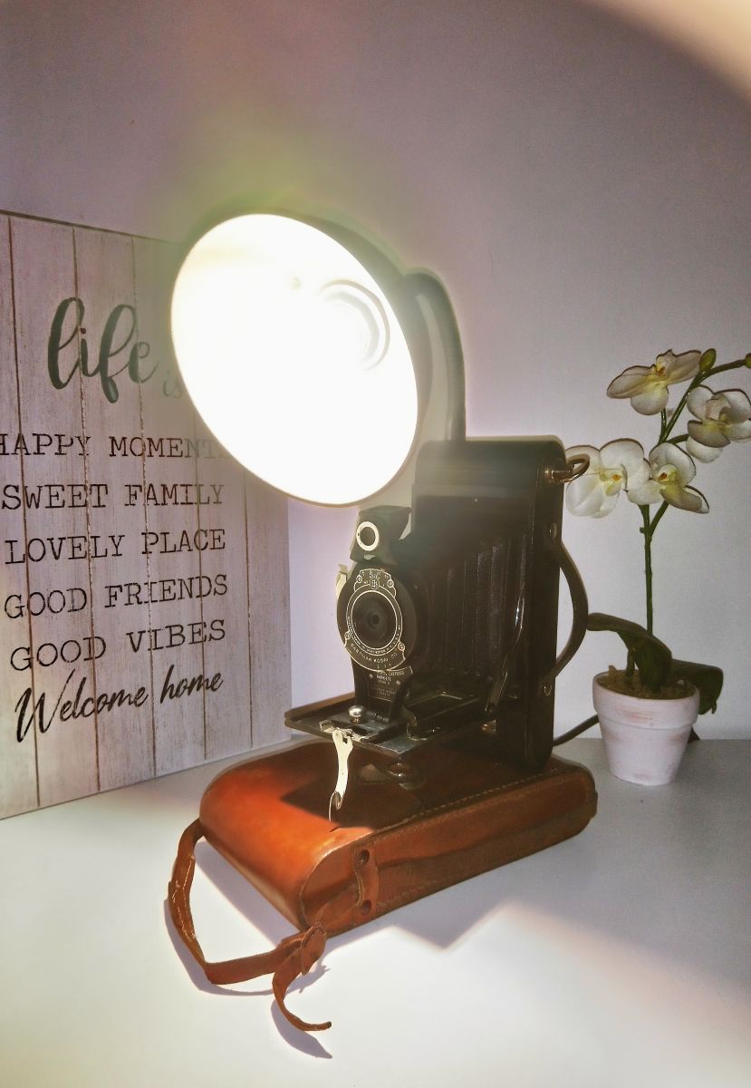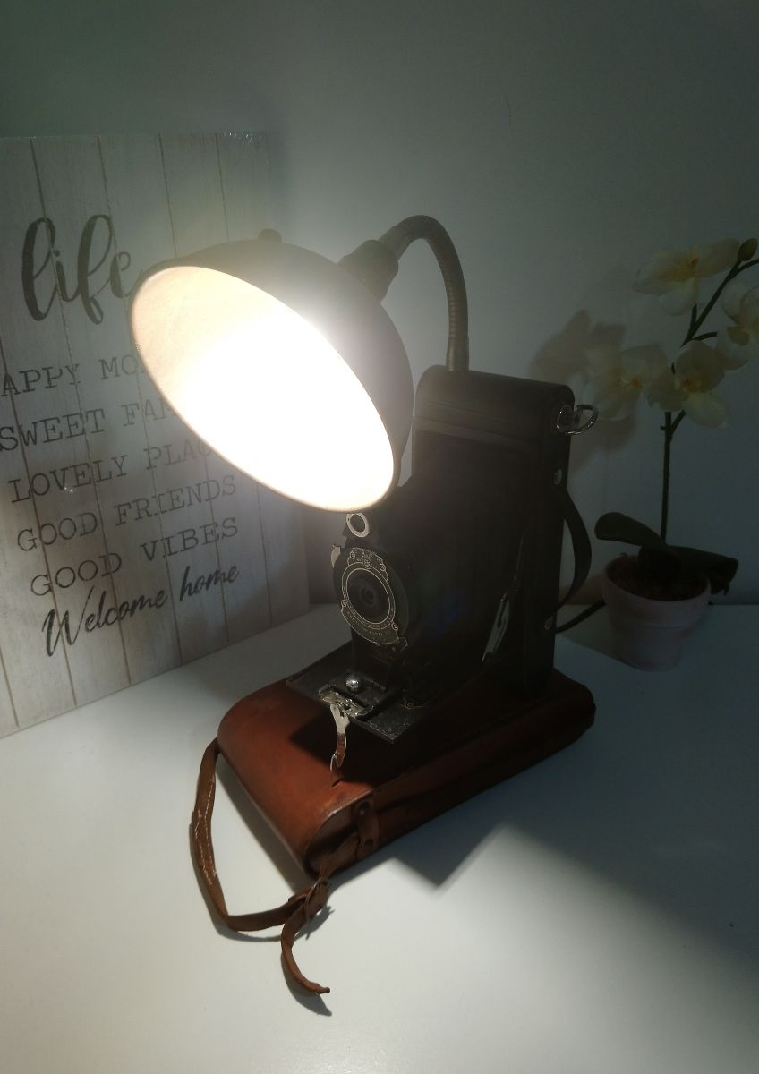 Ancien appareil photo argentique transformé en lampe à poser déco.