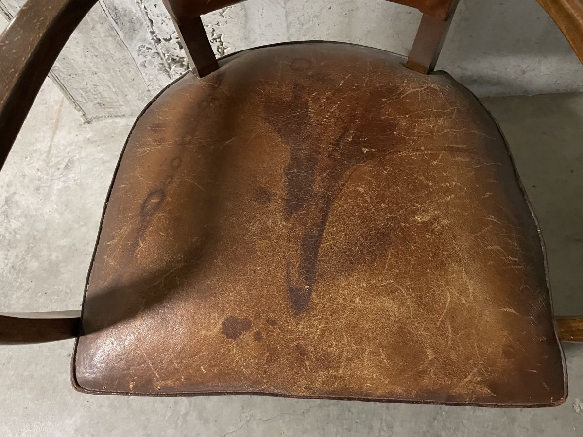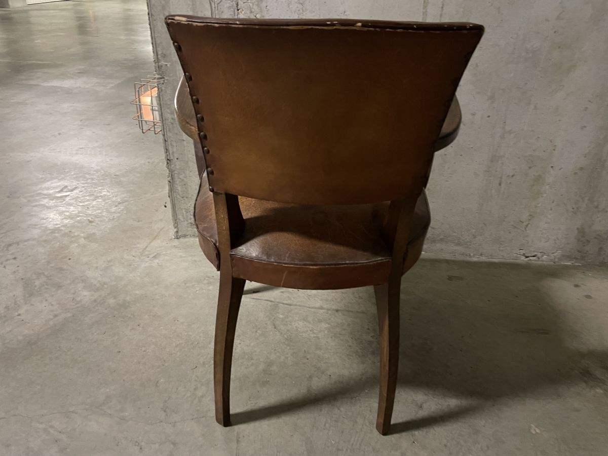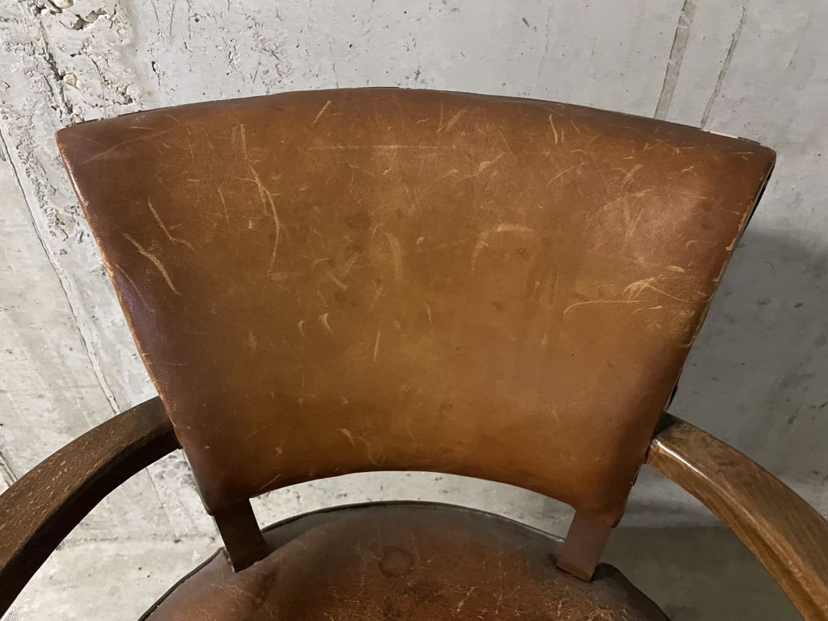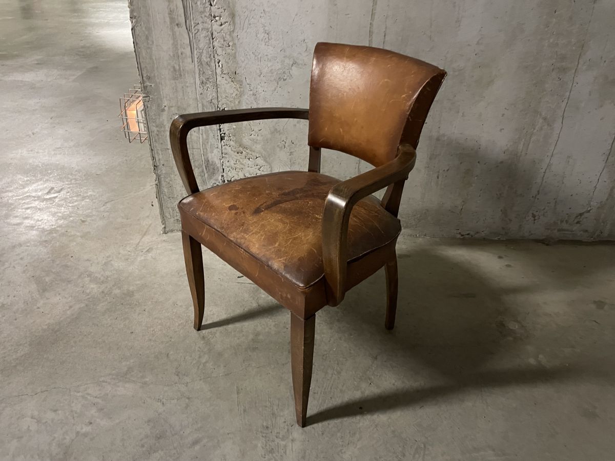Fauteuil bridge en cuir marron des années 50, dans son jus ce qui lui donne tout son charme, traces d’usage, assise correcte, hauteur 80cm, hauteur assise 46cm, assise 48x48cm.