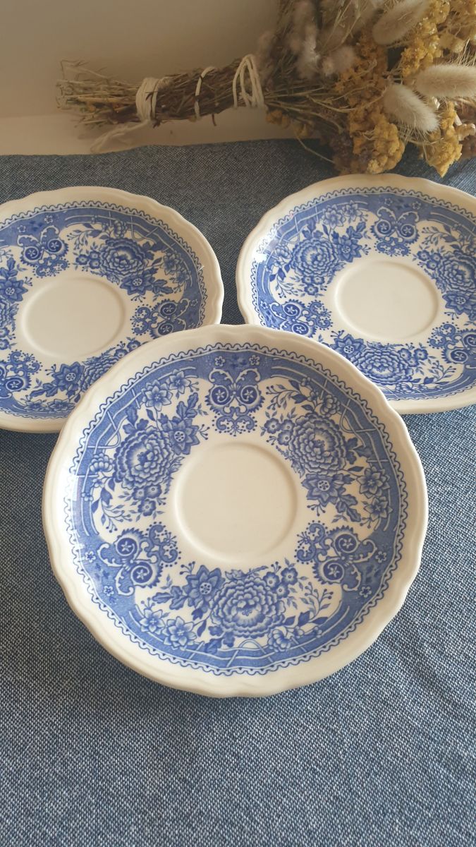 Assiette plate: diamètre 20cm hauteur 2 cm Sous-tasses: diamètre 13,5cm hauteur 2 cm Très bon état