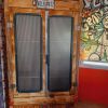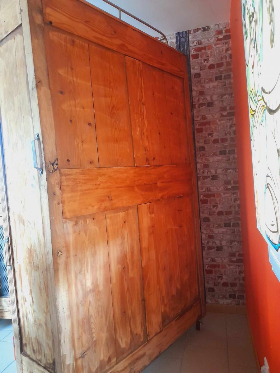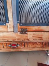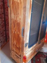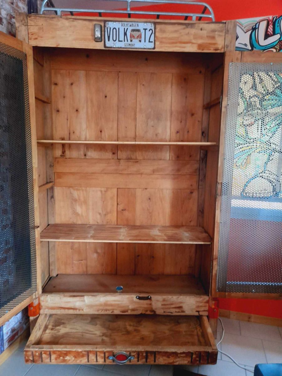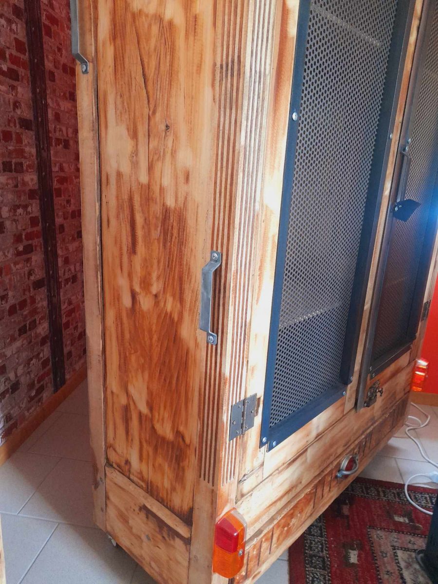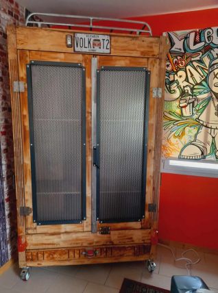 Armoire en bois massif entièrement refaite . Rajout de petits accessoires d'automobile pour lui donner un peu de charme . Mélange de métal avec le bois. Mis roulettes et poignées pour faciliter la mobilisation .