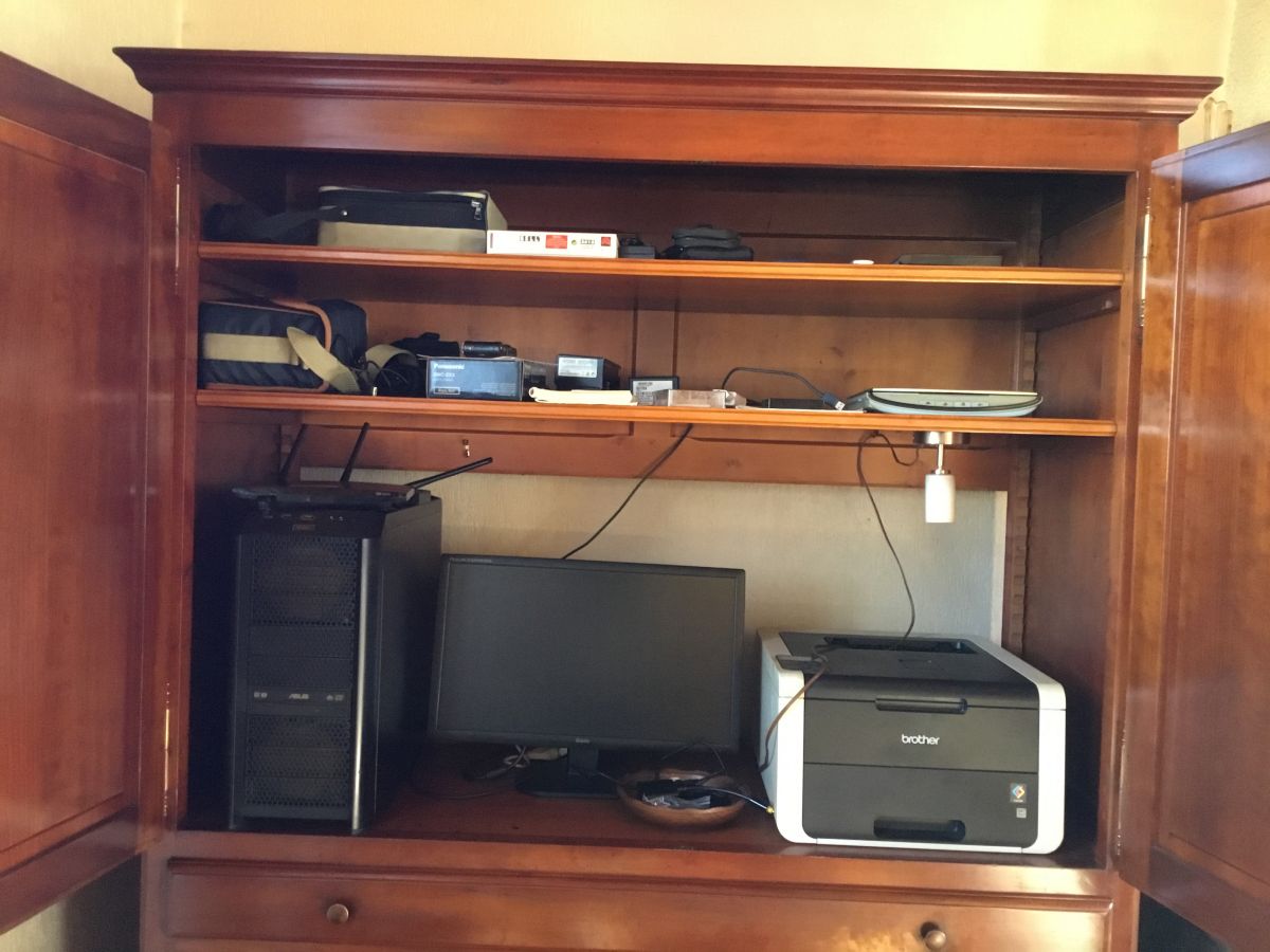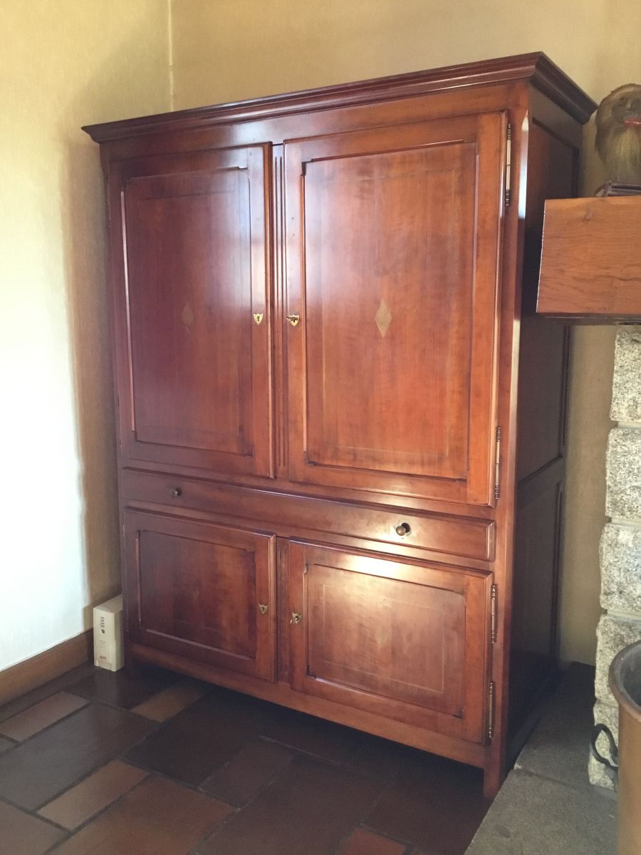 Meuble télévision ou informatique comprenant 3 espaces. Largeur 149 cm au niveau de la corniche, hauteur 190cm, profondeur 59 cm. Partie supérieure fermant avec 2 portes ( clé) comprenant 3 étagères dont une fixe et 2 réglables ( crémaillère).dimensions intérieures: 96 cm de haut, 54 cm de profondeur et 130 cm de large. Partie intermédiaire composée d’un tiroir avec bord rabat table de 125 cm de large. Partie inférieure fermant avec 2 portes ( clé) comprenant une étagère fixe et une autre réglable.dimension intérieure: 47 cm de hauteur. Confectionné entièrement en bois massif ( merisier) par un artisan ébéniste. Petite incrustation de bois plus clair au niveau du losange et pour souligner la porte.
