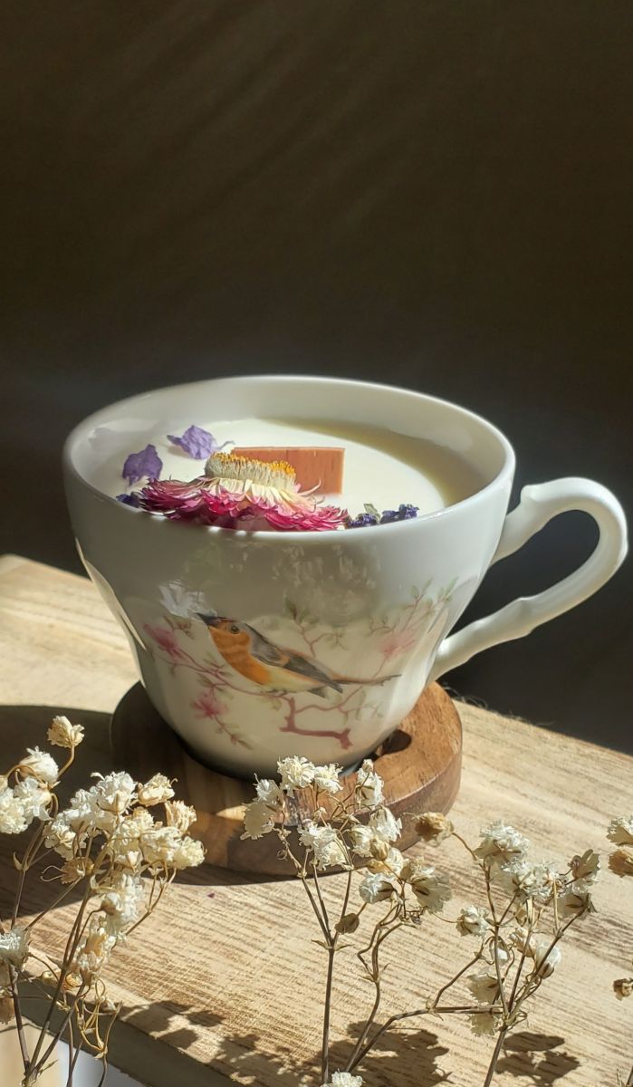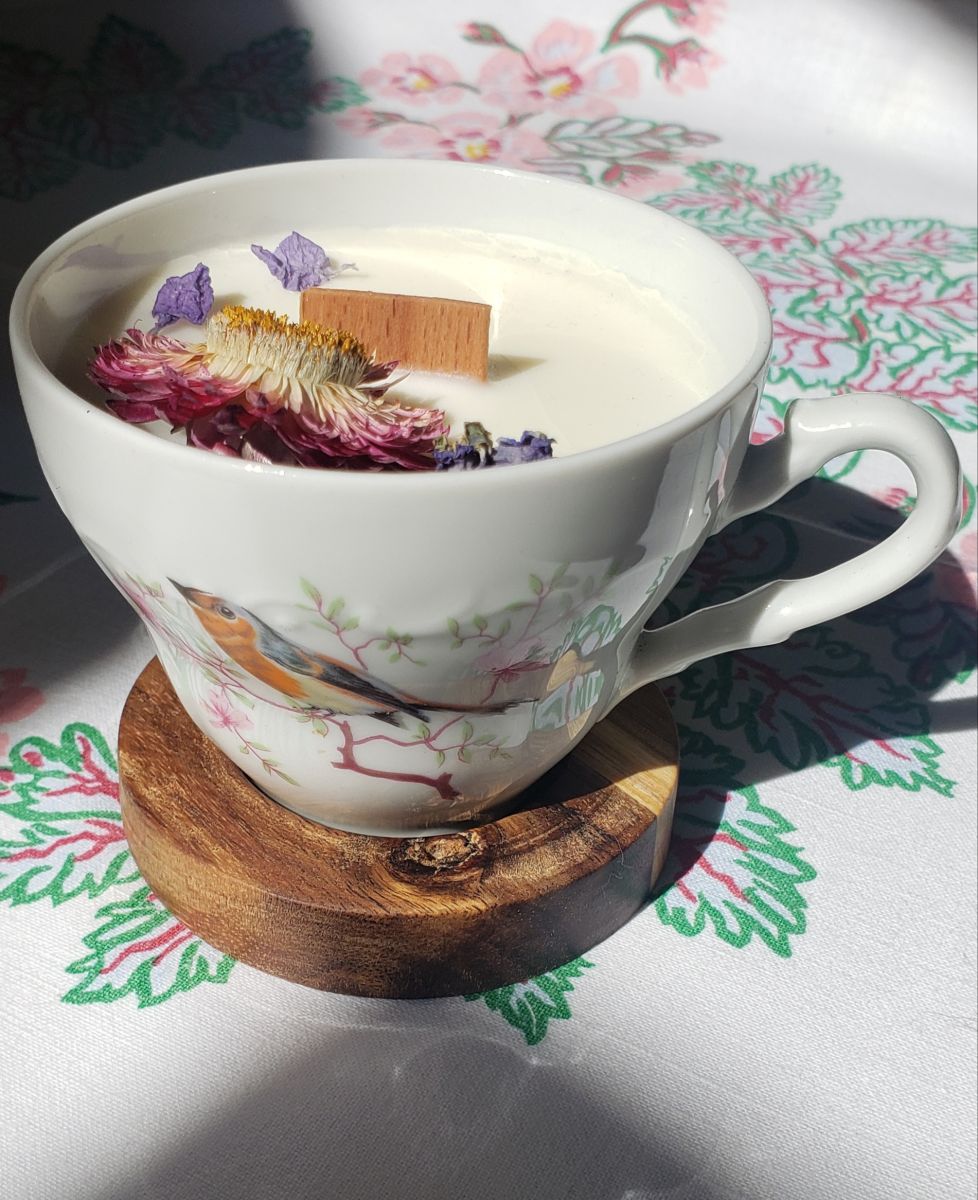 Bougie artisanale fraises des bois ~ tasse vintage oiseaux
