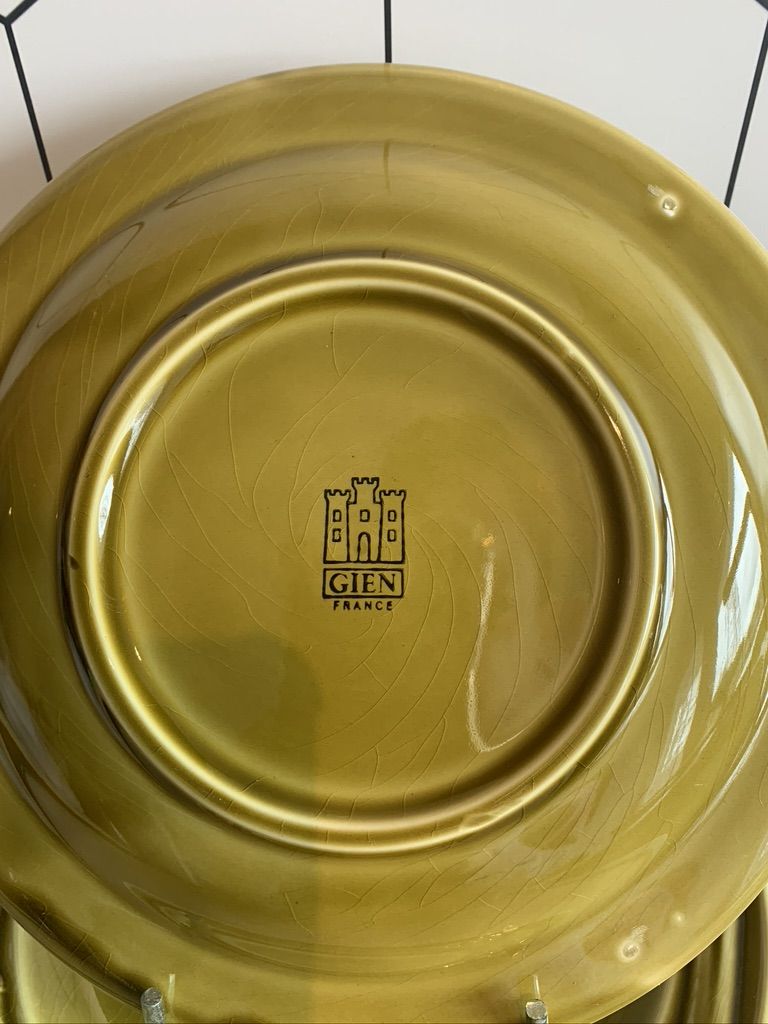 Jolies assiette à dessert de la célèbre faïencerie de Gien. Chacune d'elle porte au revers l'estampille de la manufacture, qui change tous les dix ans, et permet d'attester une production entre 1971 et 1984.