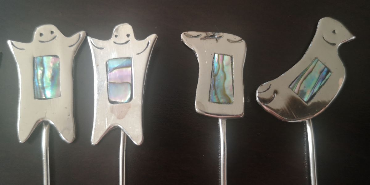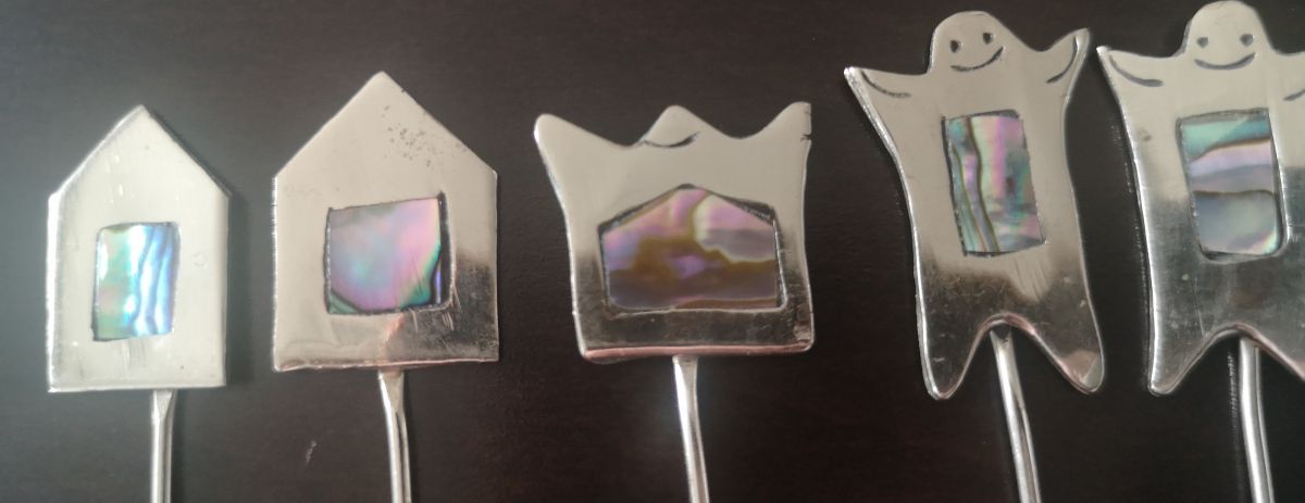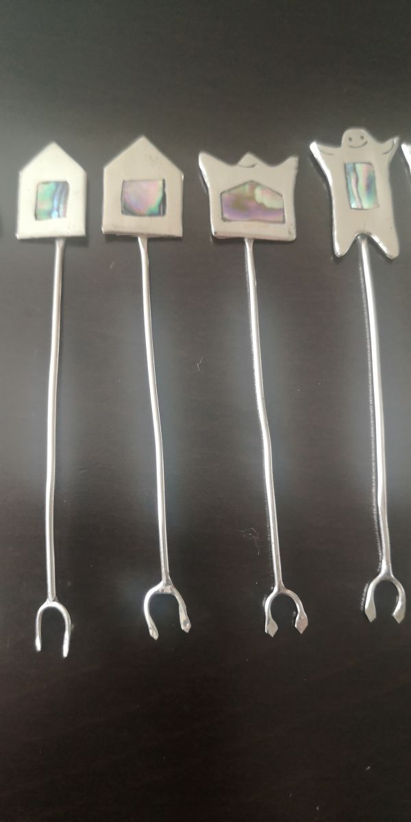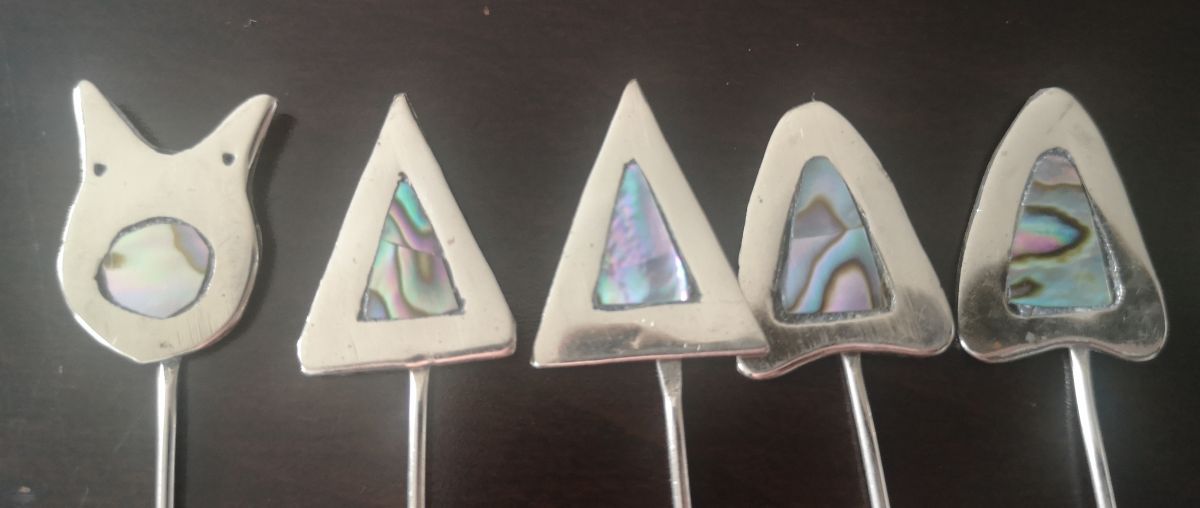 12 piques à apéritif de fabrication artisanale, métal argenté et nacre