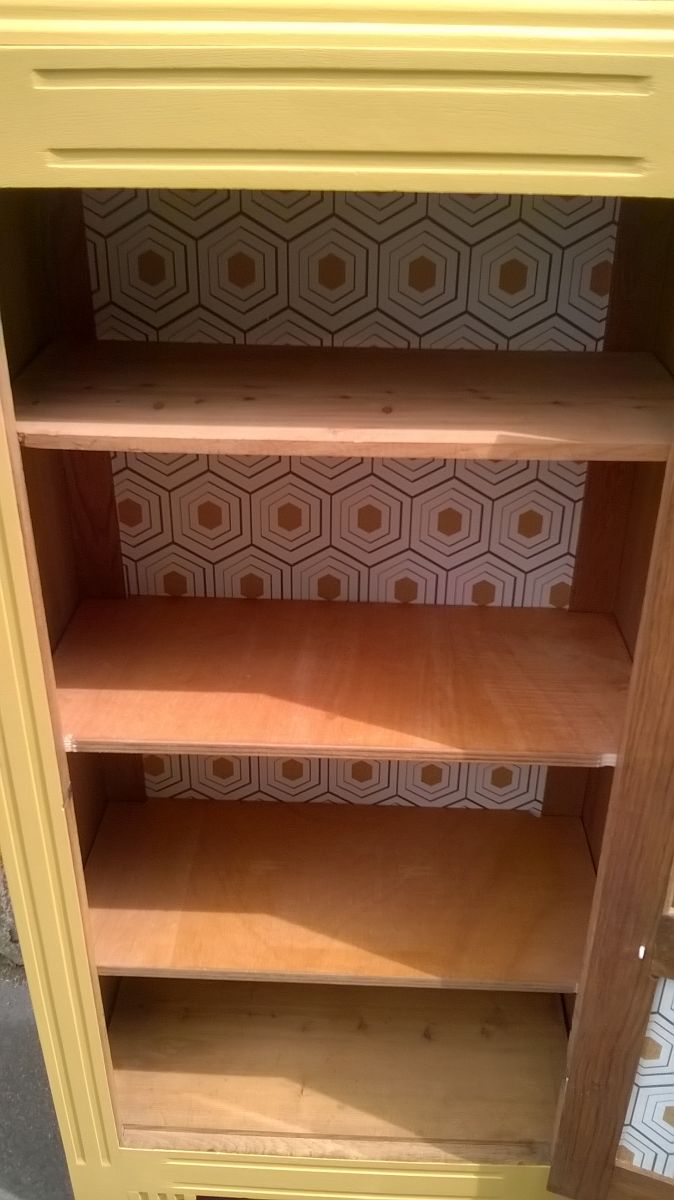 Rare petite armoire vitrine parisienne 1930. Cette armoire a été poncer et repeint de en jaune chueca. Intérieur fond et intérieur de la portes a été aménagée d un papier art déco. Aménagée de 3 étagères a tasseaux fixe. La vitrine est stable et solide. Hauteur totale 137 cm. Largeur 65 cm. Profondeur extérieur 32.5cm. Profondeur intérieur 27 cm. A noté il y a un petit trou qui a été fait par l'ancien propriétaire pour passez un cable.