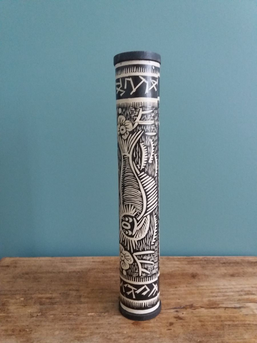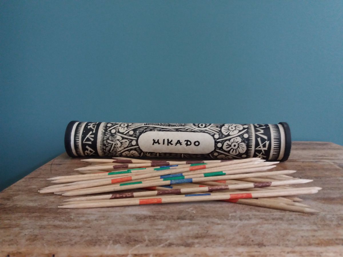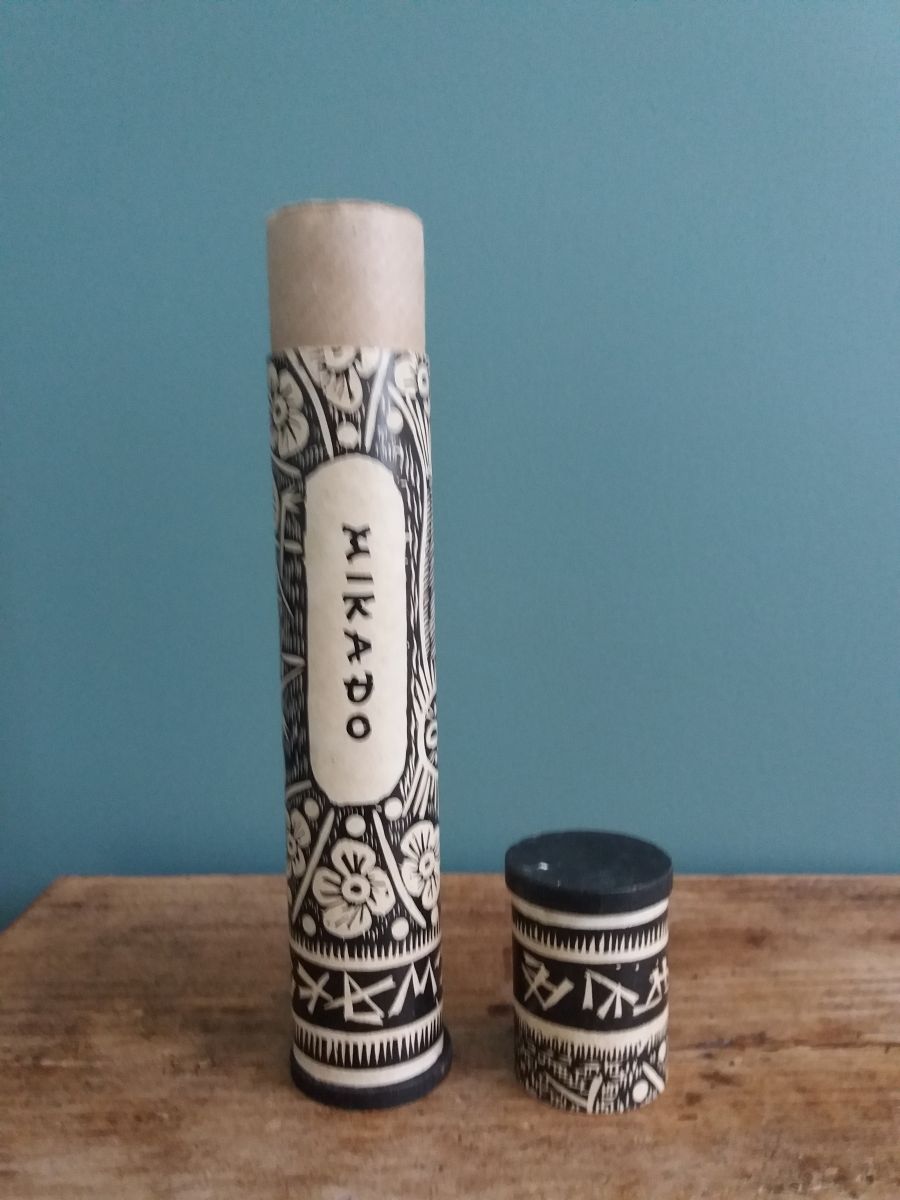 Jeu de mikado présenté dans un joli étui tubulaire en carton décoré de motifs très graphiques dans un style japonisant, plutôt original par rapport aux boites en bois à glissière assez communes, et très décoratif. Le jeu est complet, il contient les 40 bâtonnets ainsi que la règle du jeu en français et en allemand que je n’avais failli pas voir car elle est enroulée dans la boite. Il date probablement des années 60 ou 70. L’ensemble est en bel état, les bâtonnets sont intacts et bien droits, la boite est en bon état structurel avec juste quelques petites marques d’usage, une déchirure sur la règle du jeu. La boite mesure 23 cm de longueur pour un diamètre de 4 cm