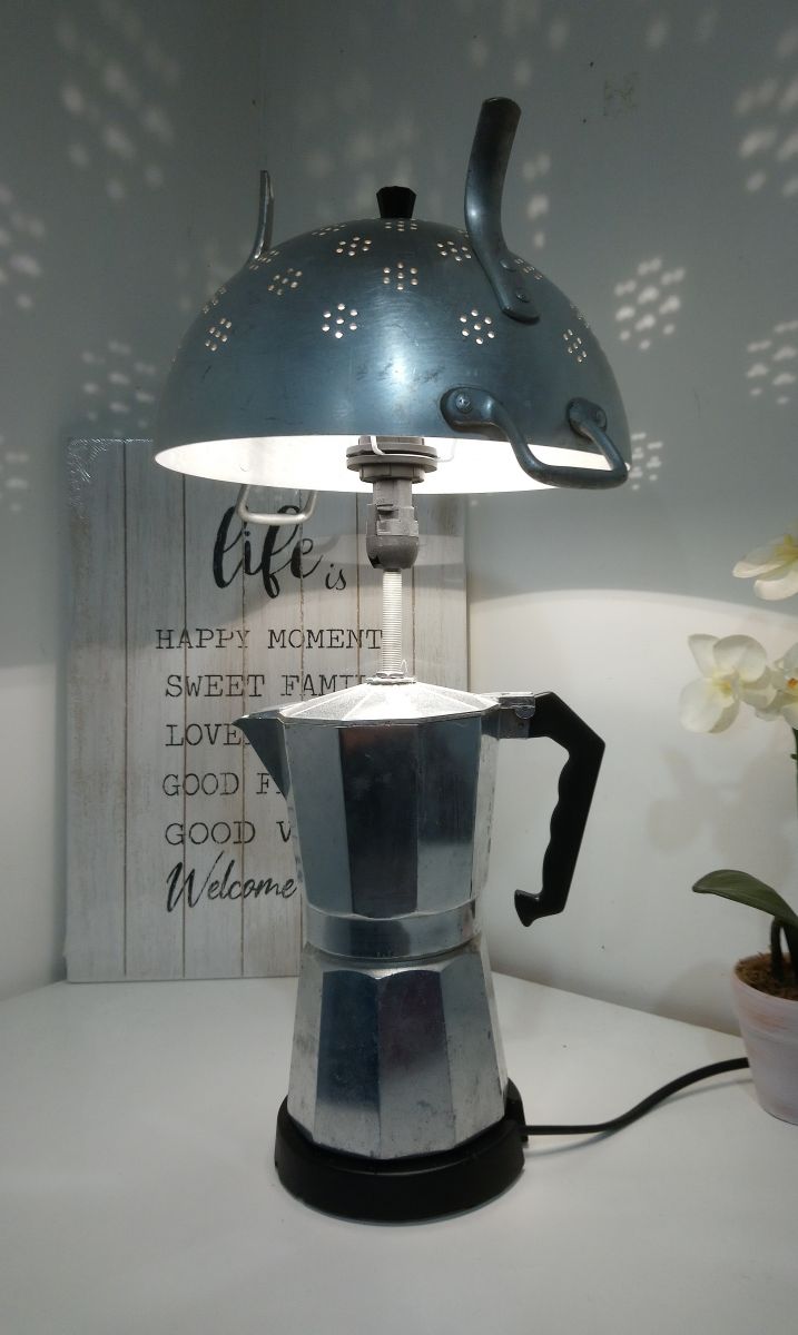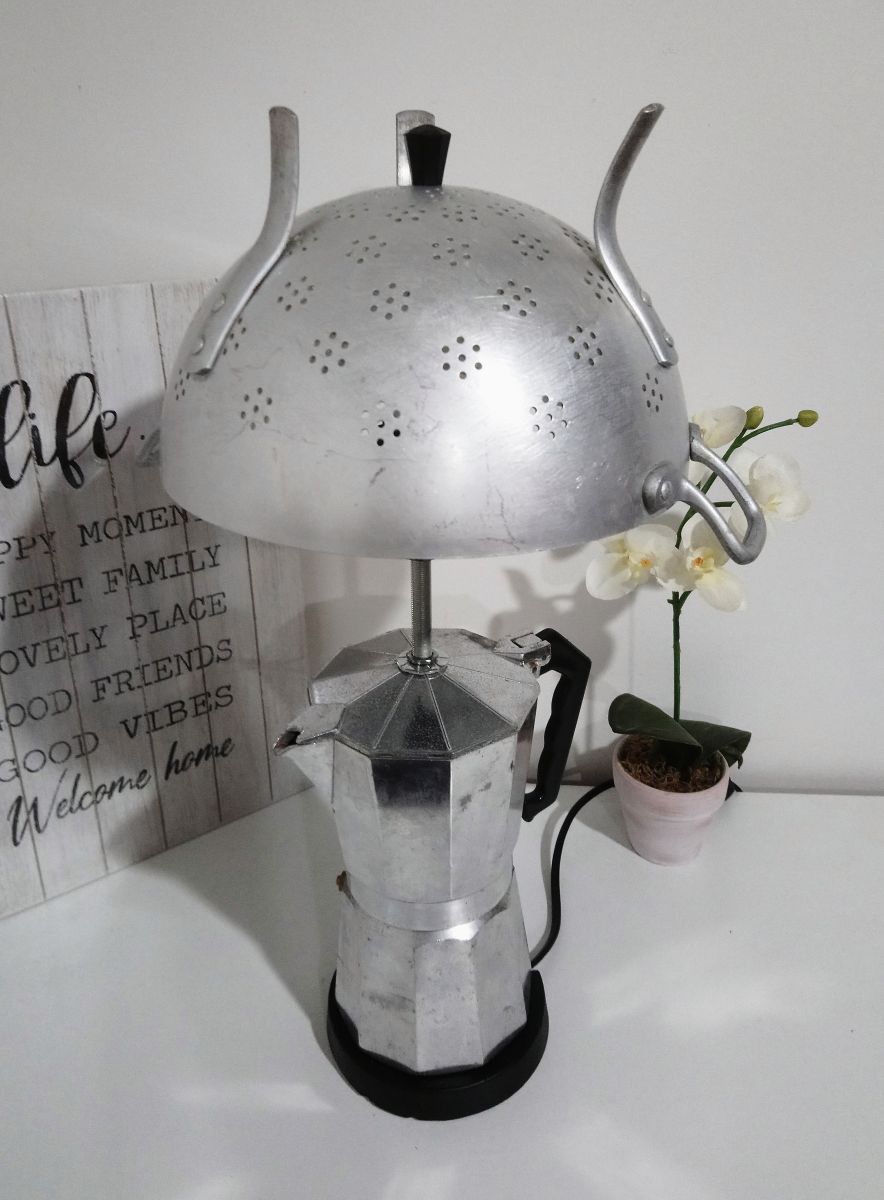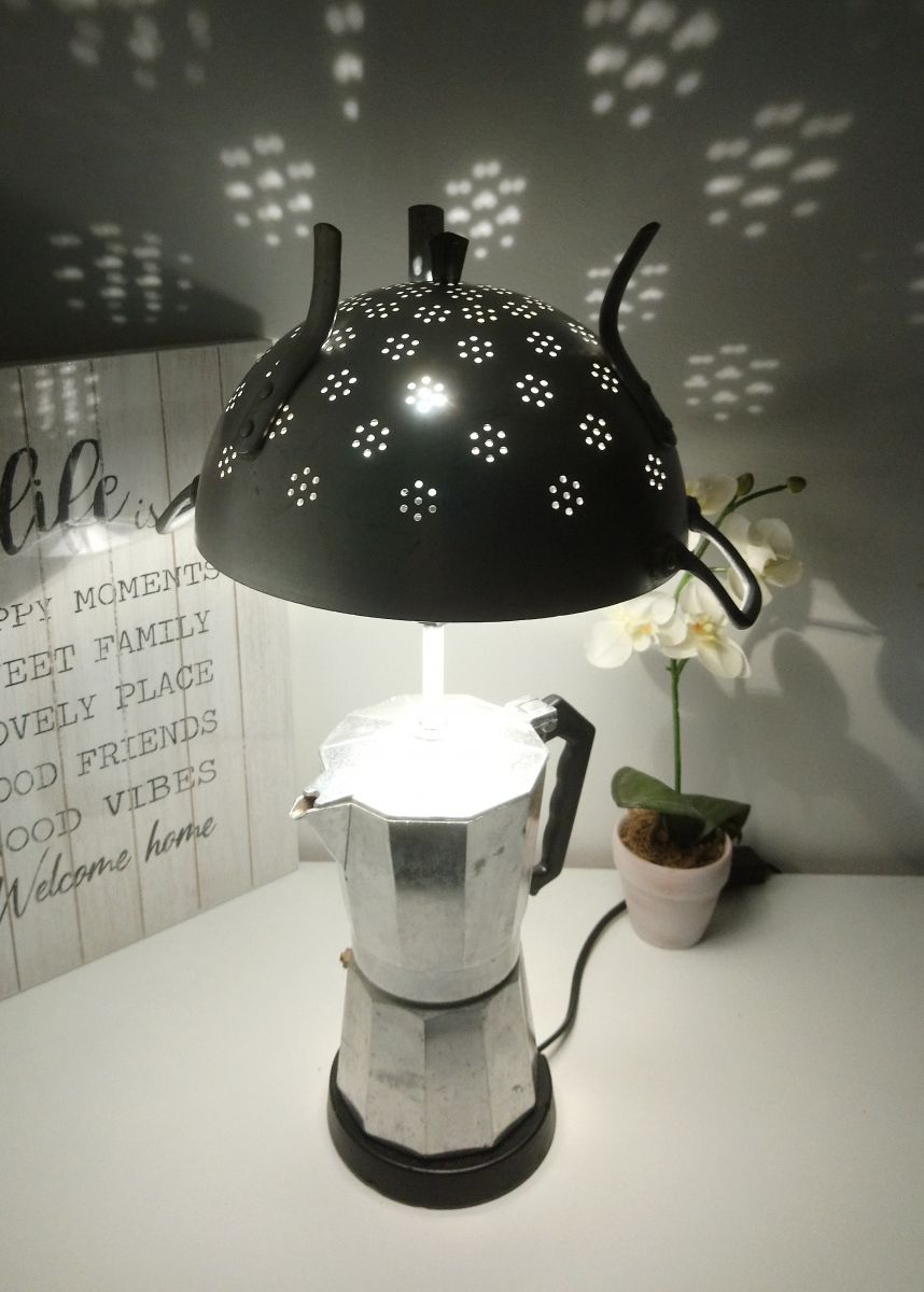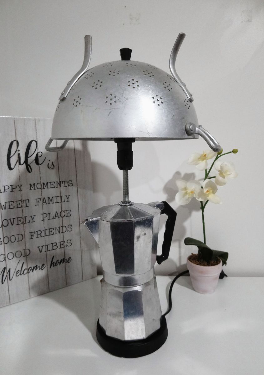 Lampe à poser déco récup conçue sur la base d'une ancienne cafetière italienne alu et d'une passoire en guise d'abat-jour.