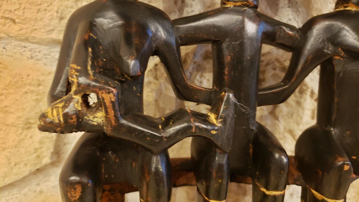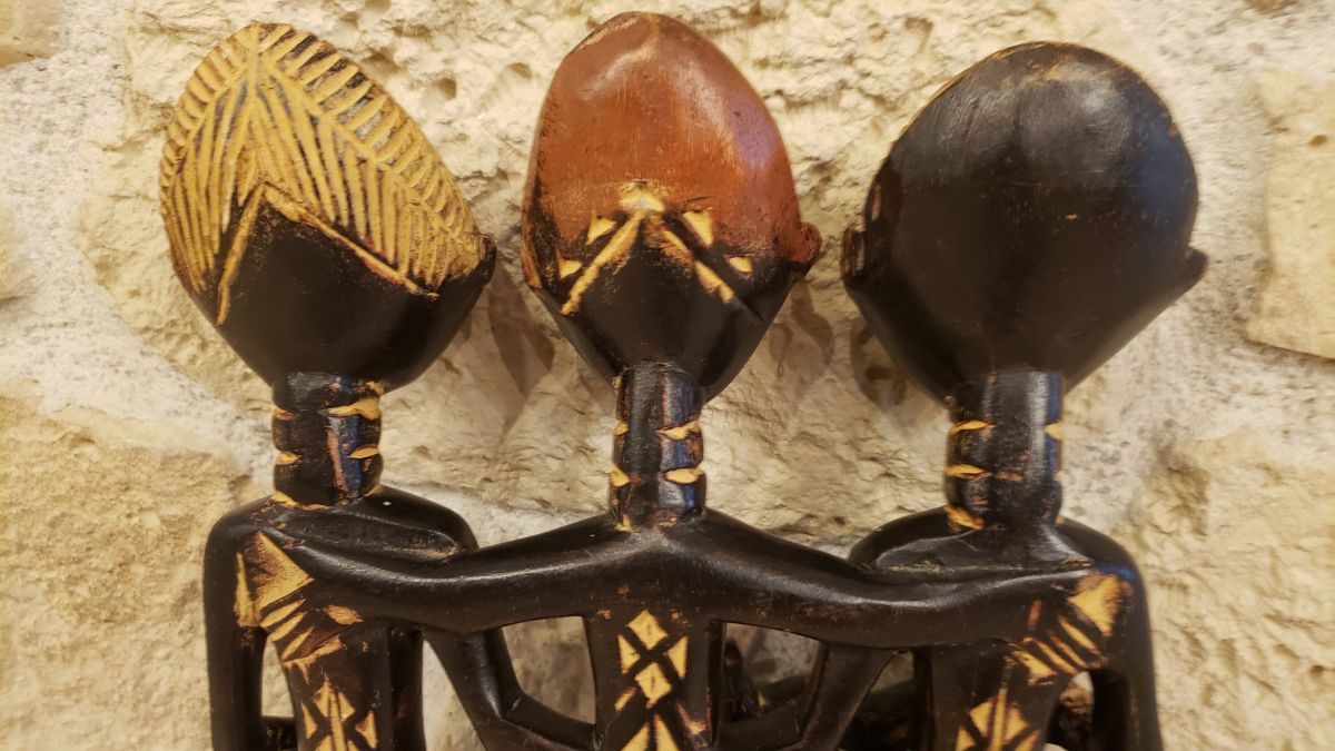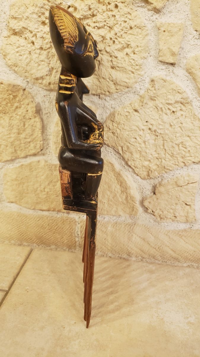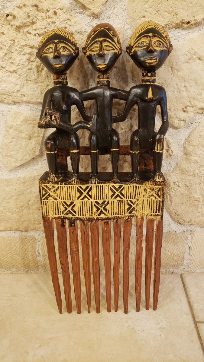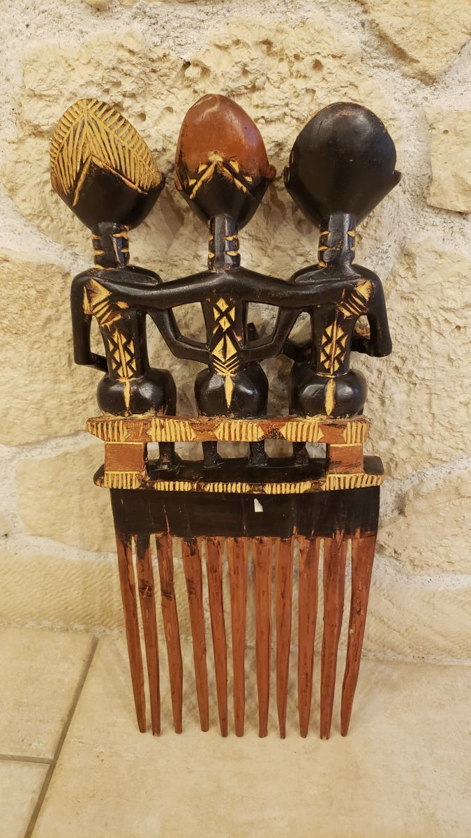 Il s'agit d'un peigne en bois Ashanti sculpté à la main vintage du Ghana. Chez les Ashanti, les peignes étaient donnés par les hommes aux fiancés, épouses et amies comme un acte de dévotion et d'engagement. La longue association des Ashanti avec l'Europe est attestée par l'utilisation fréquente de symboles occidentaux, même dans l'art traditionnel du XIXe siècle et avant. En gardant les cheveux d'une femme bien coiffés et coiffés, cela démontre qu'elle est riche et n'a jamais besoin de porter de fret sur sa tête. Ainsi le peigne devient une marque de prestige pour son propriétaire. Ce peigne serait un bel ajout à votre maison ou à votre collection. Chaque peigne a un design unique.