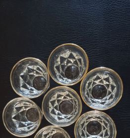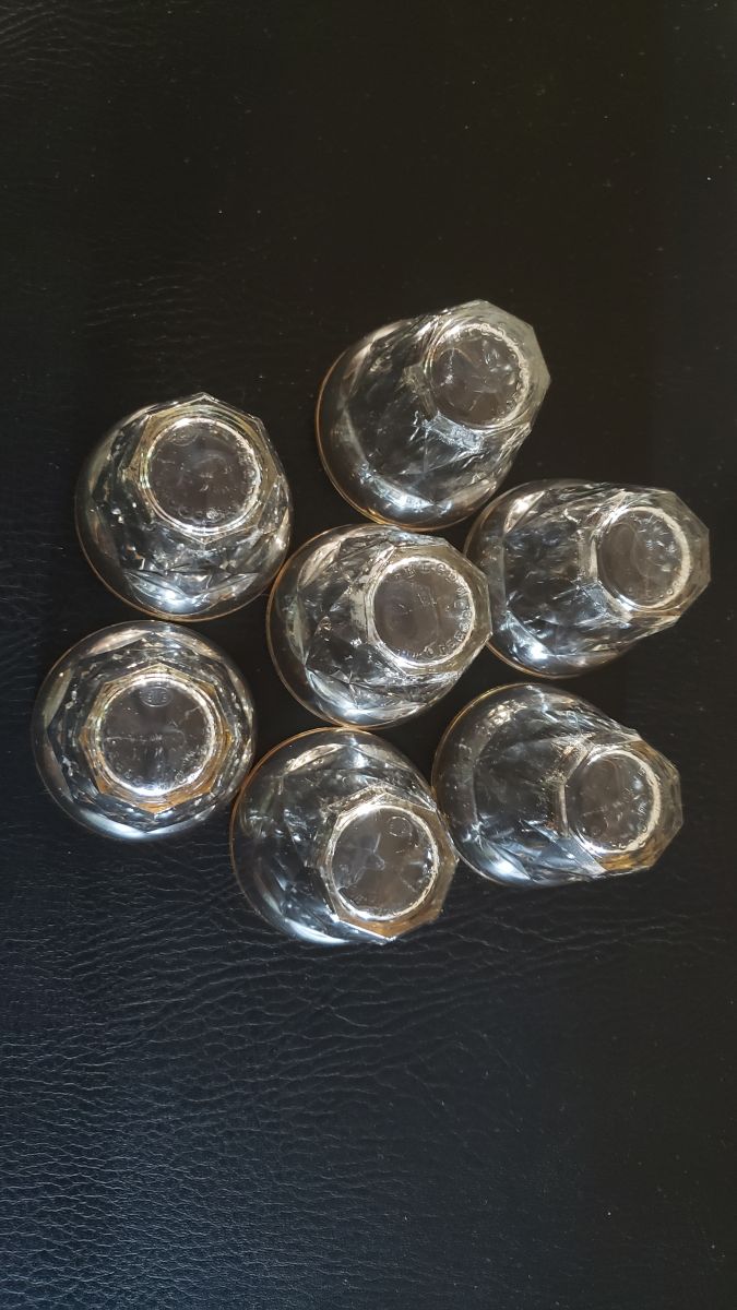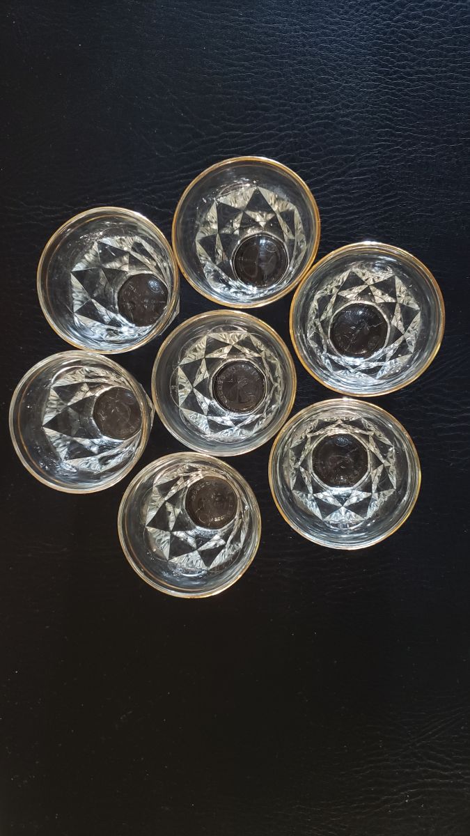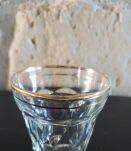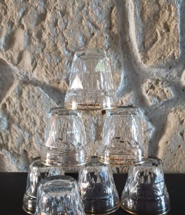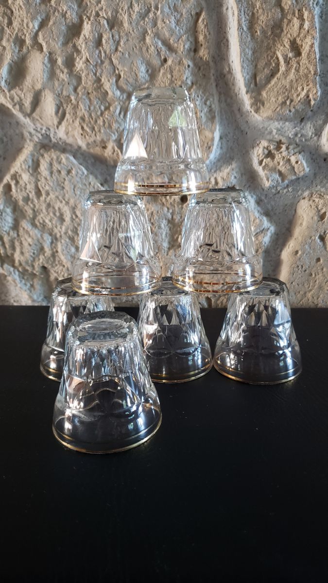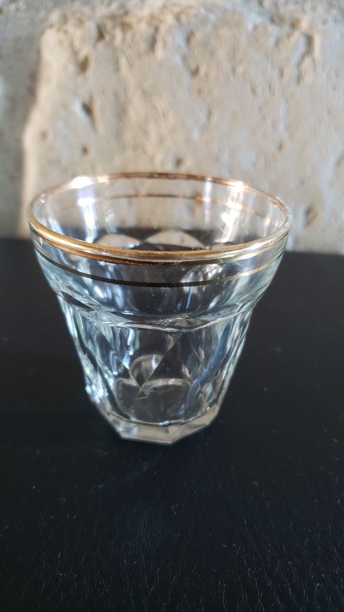Lot de 7 verres à facettes forme gobelet avec un liséré doré.