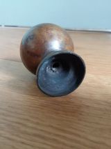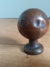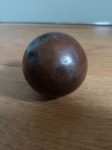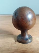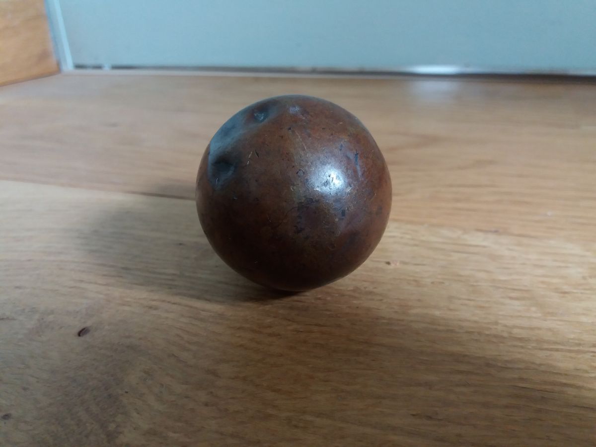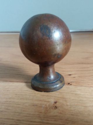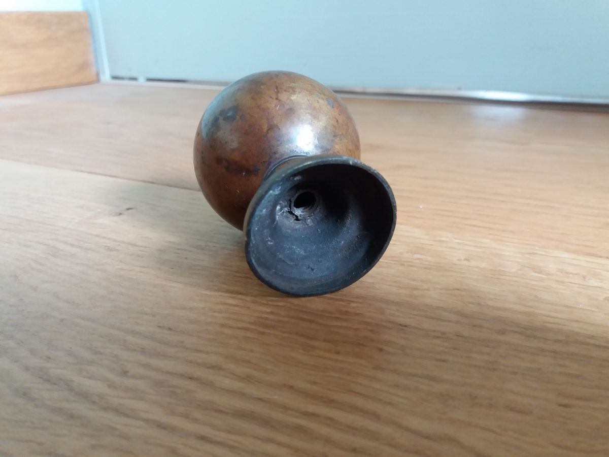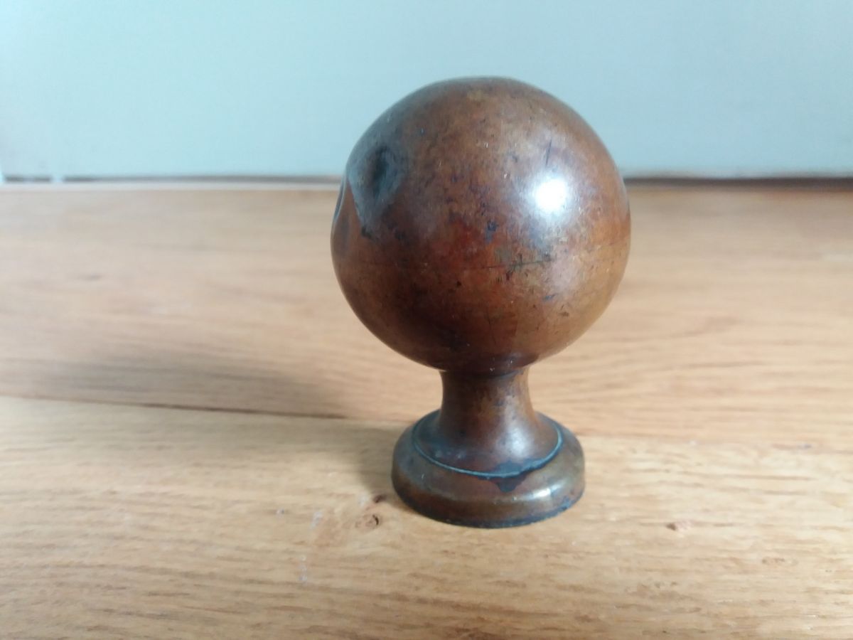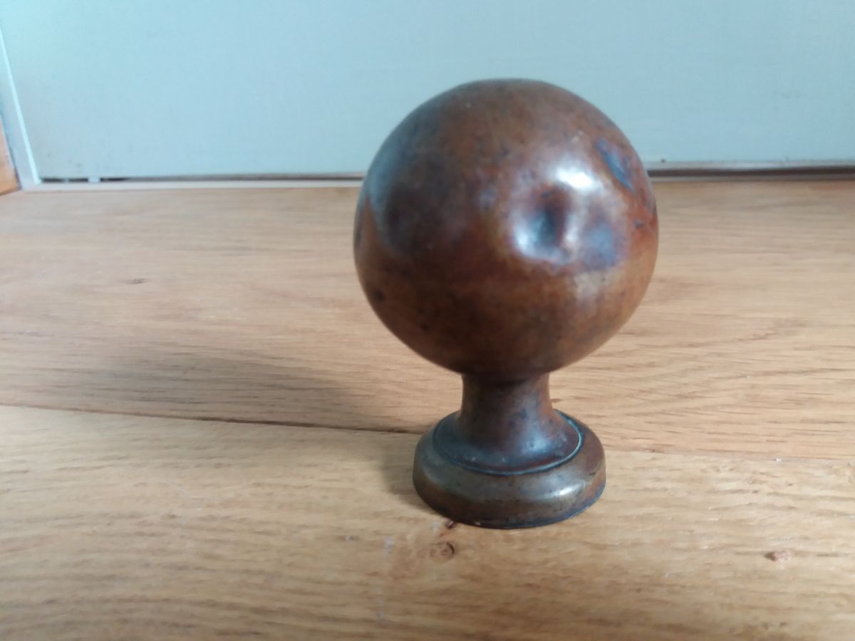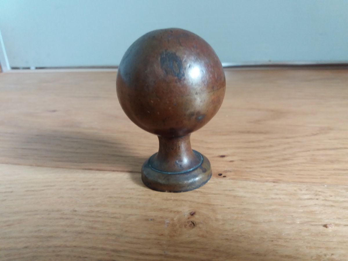 Charmante boule d’escalier en métal, du bronze peut-être, très joliment patiné par le temps et l’usage, avec un toucher doux, lisse. La couleur bronze doré présente de multiples tons, bronze, or, chocolat, caramel… difficiles à rendre sur photos. Enfin je dis « boule d’escalier », mais je ne suis pas certaine qu’il s’agisse de cela, peut-être une boule surmontant un chenet ? Elle est munie d’un pas de vis à l’intérieur du col, dans la partie la plus resserrée. Elle est encore bien solide, pas de fissure, mais présente de nombreuses marques du temps et de l’usage : des enfoncements plus ou moins important, des taches et marques diverses. Elle mesure 7 cm de hauteur, et 5 cm de diamètre pour la boule, 3,6 cm pour la base. Difficile de mesurer le diamètre du pas de vis à l’intérieur, peut-être 5 ou 6 mm. Elle pèse environ 80 g.