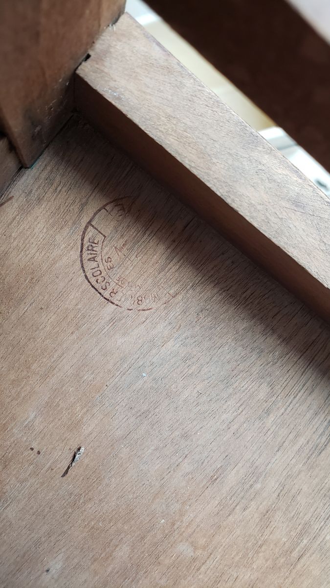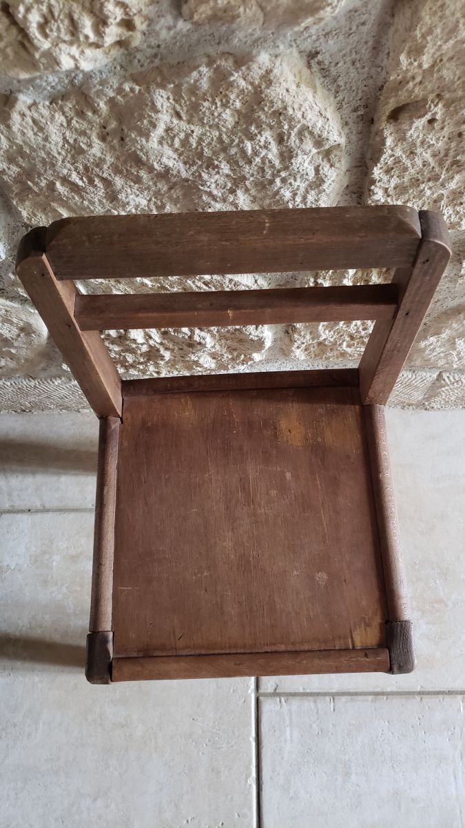 Charmante et authentique chaise d'écolier en bois massif. Elle est tamponnée en dessous.