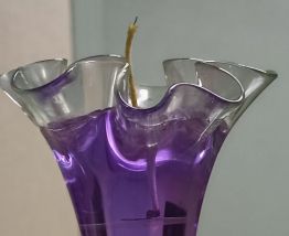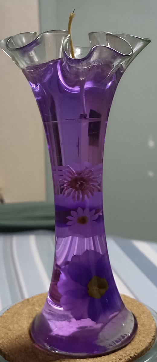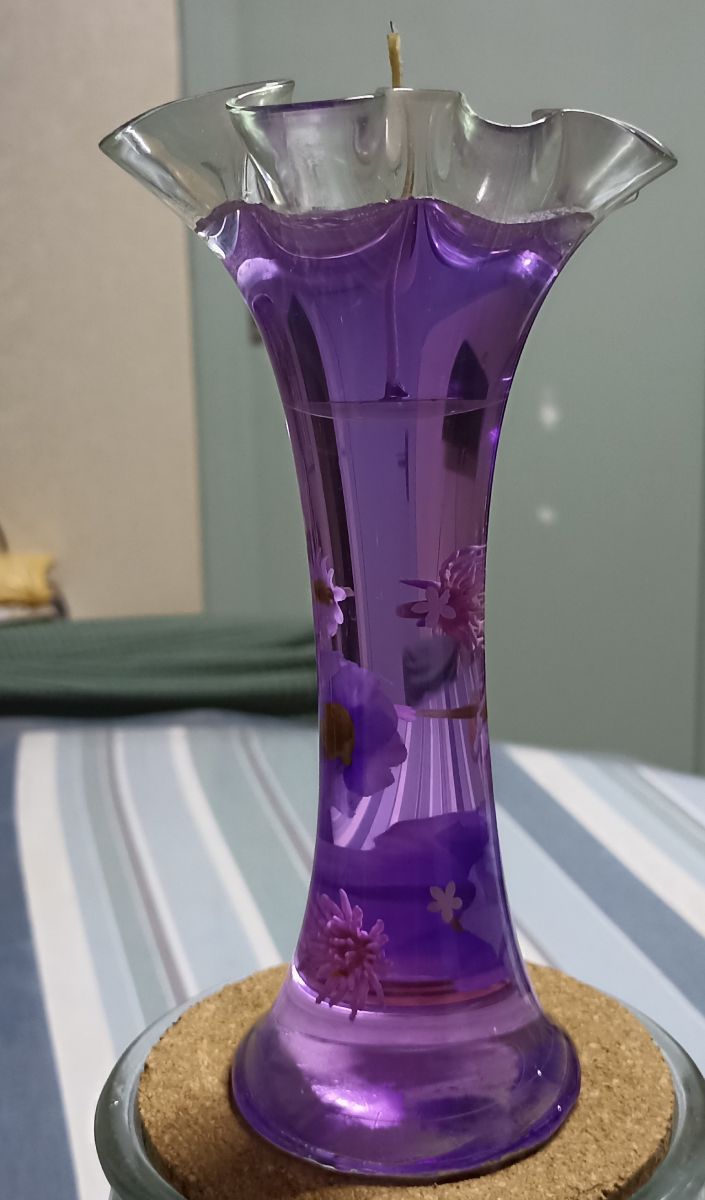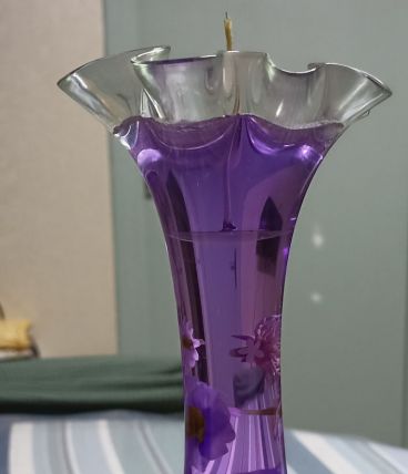 Cette bougie gel est présentée dans un vase soliflore artisanal festonné sur le haut, véritable verre soufflé
