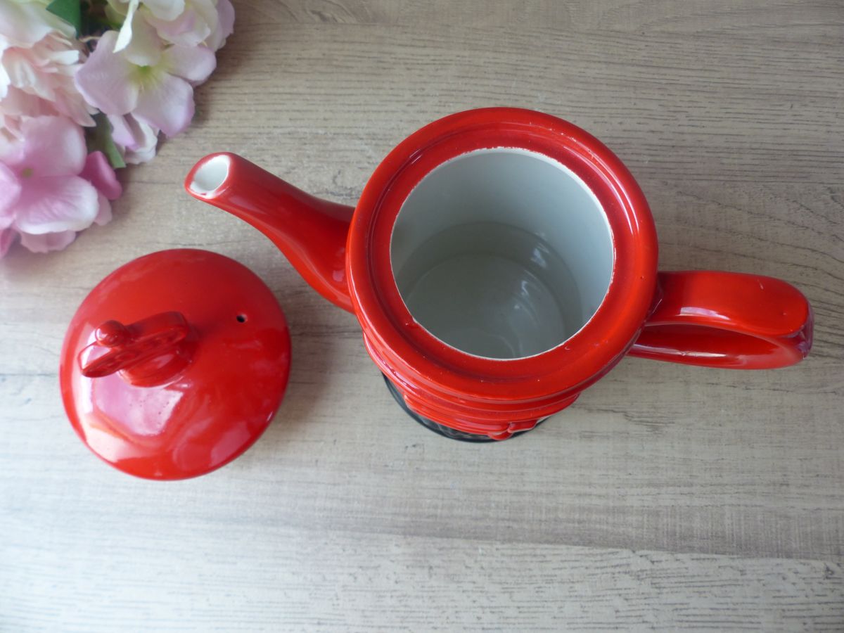 Elle est en céramique rouge et noire de finition brillante.