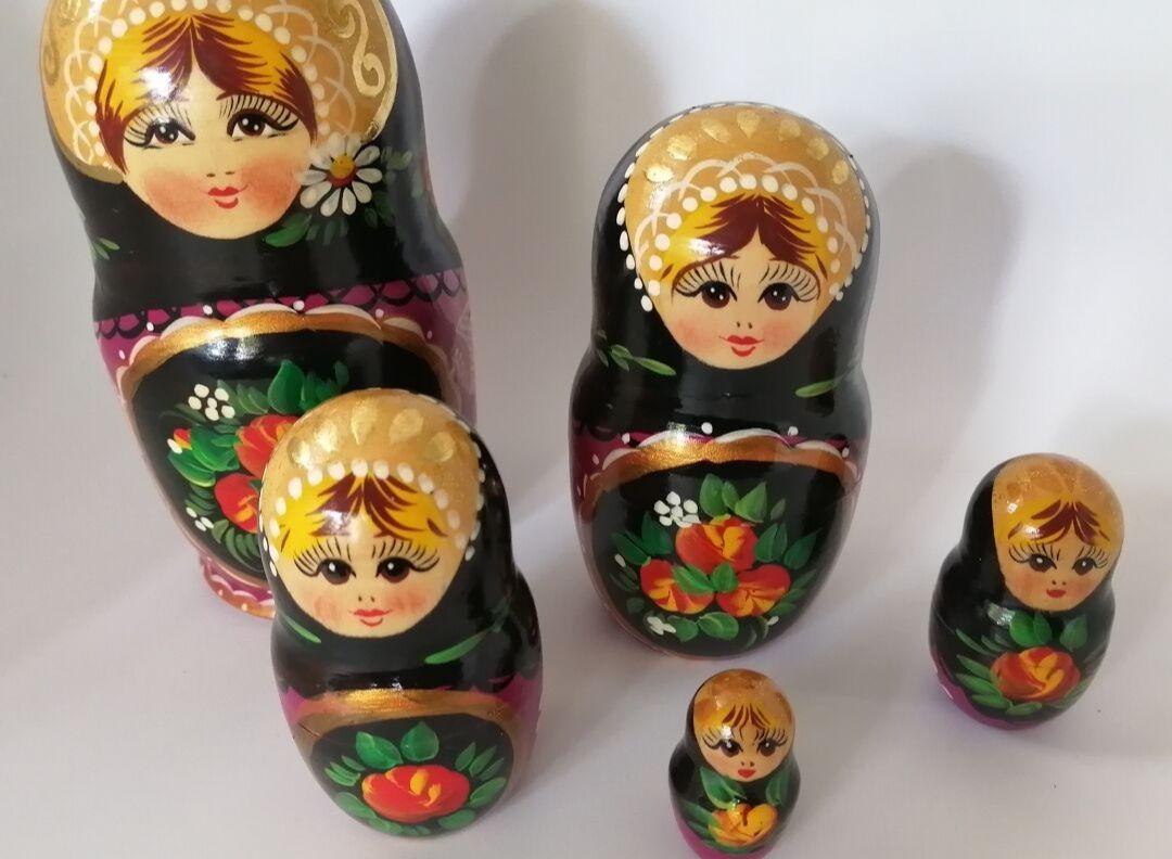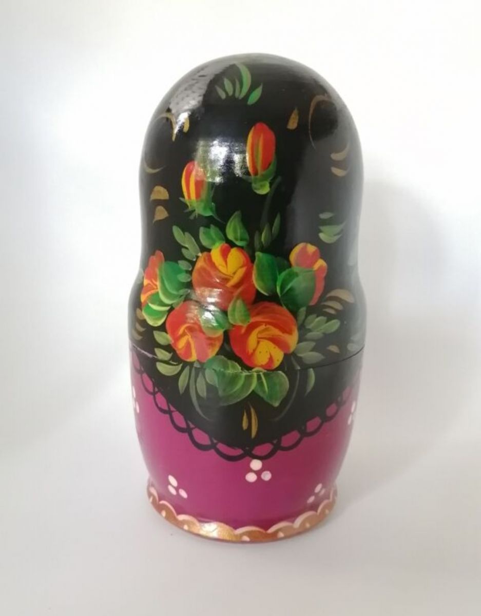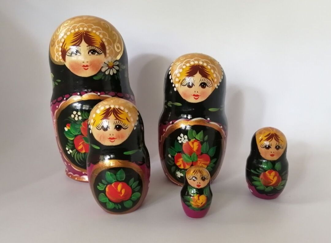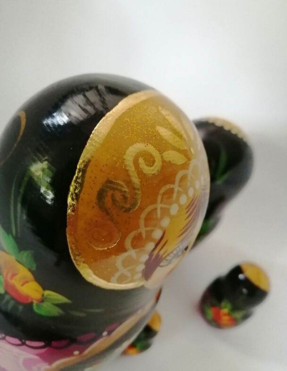 Magnifique famille de poupées Russes aux couleurs chatoyantes bordées de doré. Bois. Excellent état.