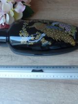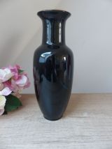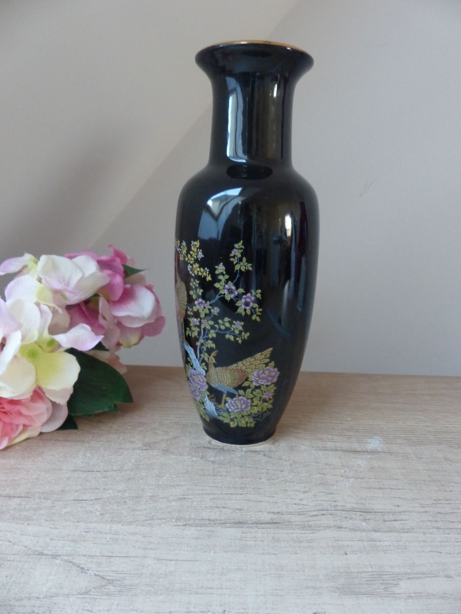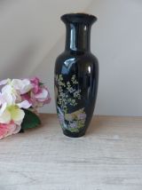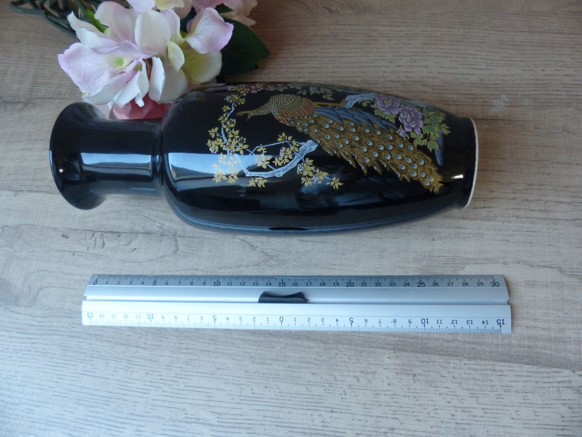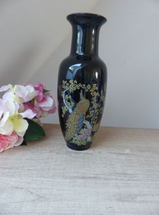 Ancien Vase Noir Décor Fleurs et Paon en Céramique Fabriqué