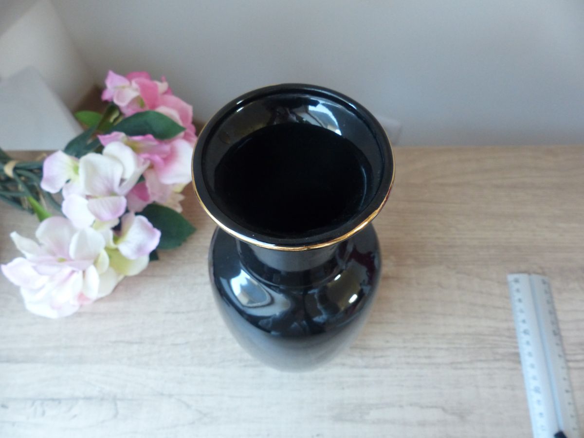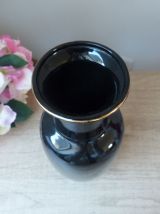 Ce vase est ancien. La bordure dorée a été peinte à la main. On peut voir un trait de peinture légèrement plus épais sur le bord. Usure normale.