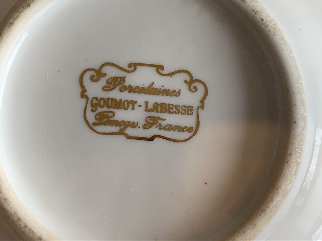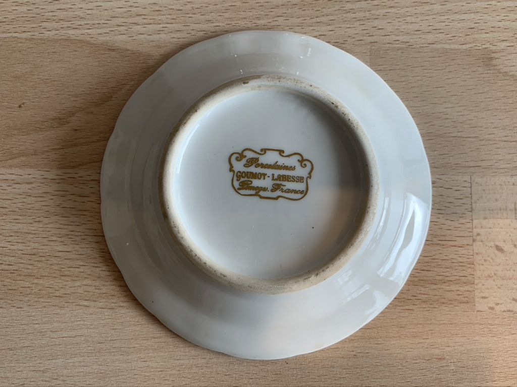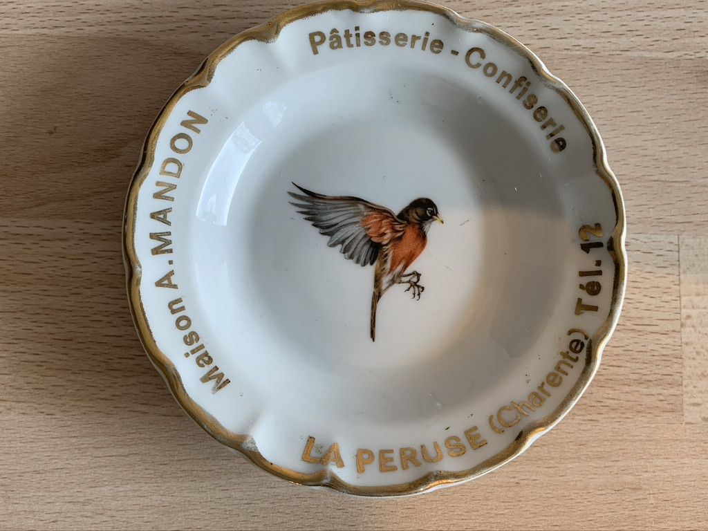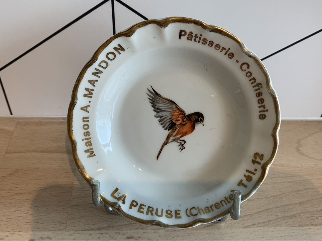 Cendrier publicitaire vintage en porcelaine de Limoges produit par Goumot Labesse pour la maison A Mandon en Charente.