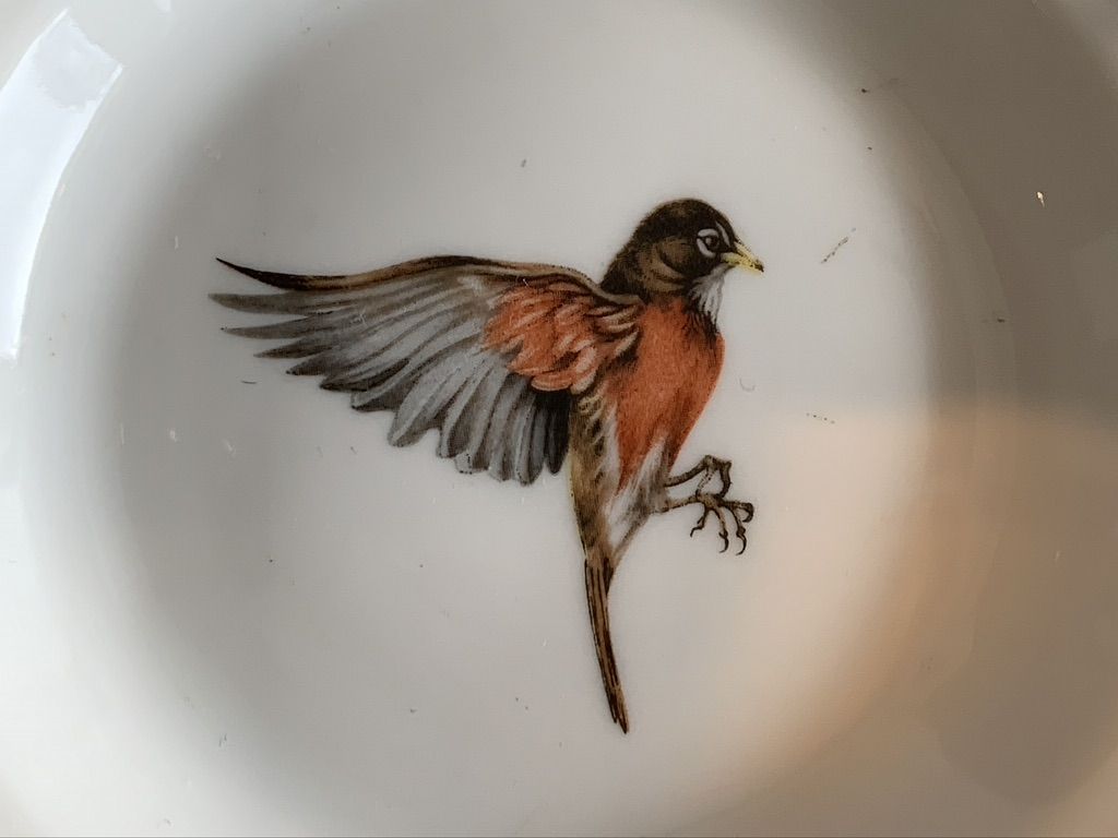 Ce joli cendrier est décoré en son centre d'un beau motif représentant un oiseau aux couleurs magnifiques. L'ensemble est en parfait état, les dorures sont très légèrement passées et l'oiseau est intact.