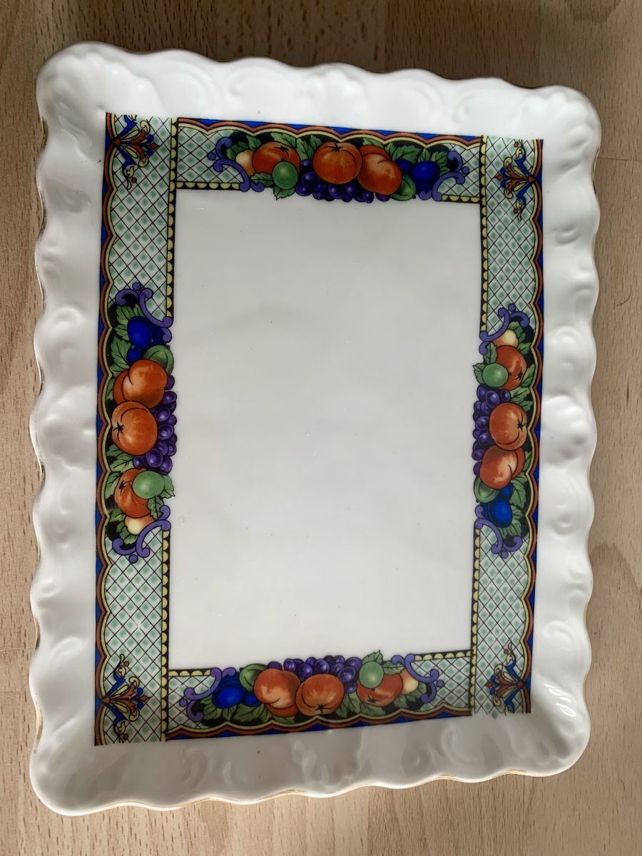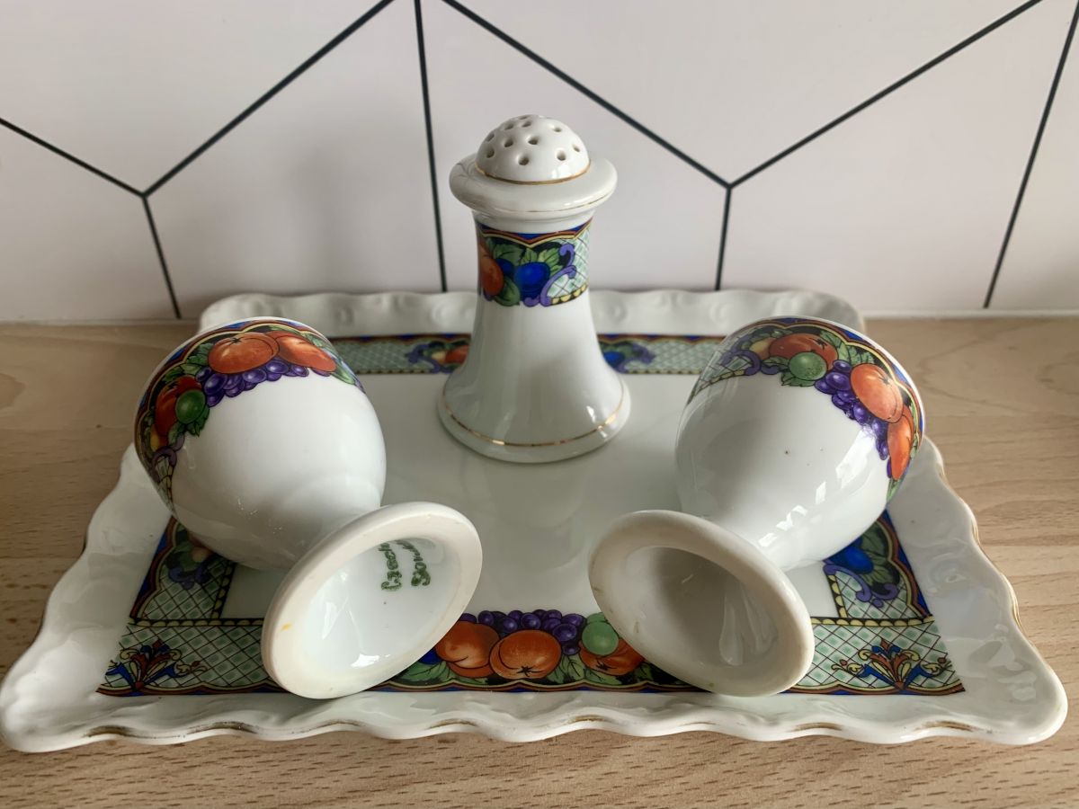 Ce service se compose d'un plateau, d'une salière et de deux coquetiers, décorés de jolies frises avec des fruits.
