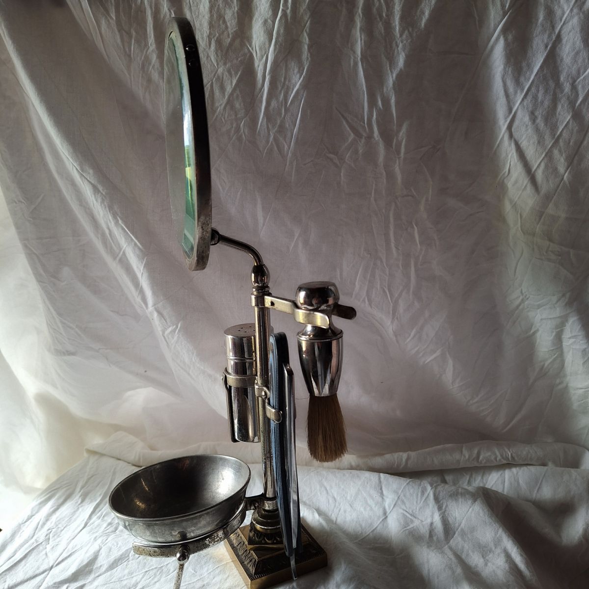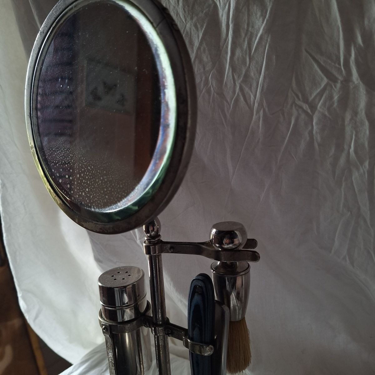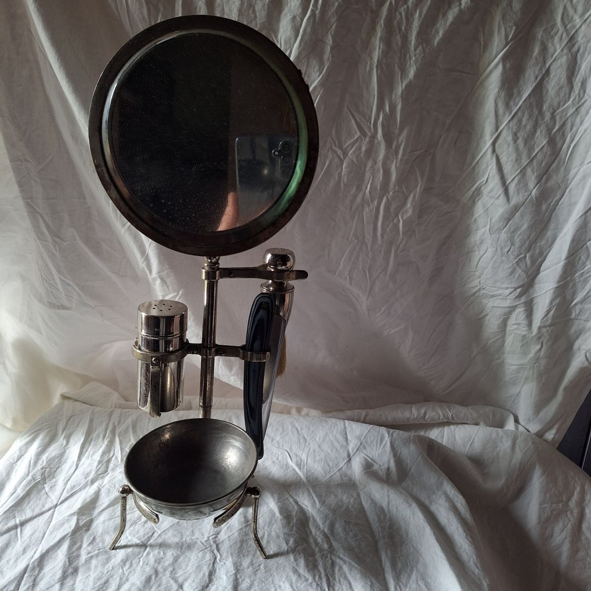 Article vintage, miroir un peu piqué , et contour un peu usé, sinon complet avec blaireau,coupe chou, bol et tube pour poudre. Idéal déco .