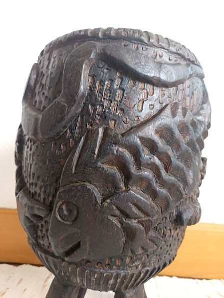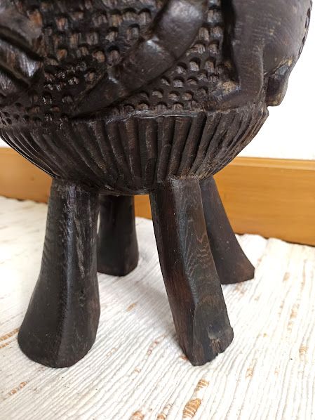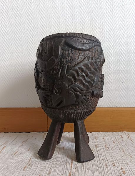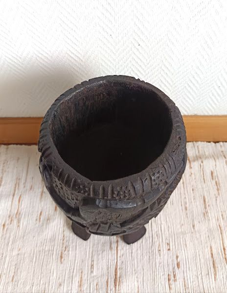 Grand mortier en bois africain reposant sur quatre pieds. Style brutaliste.