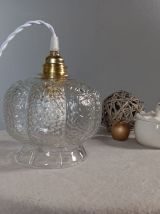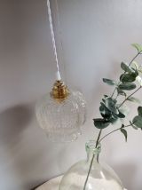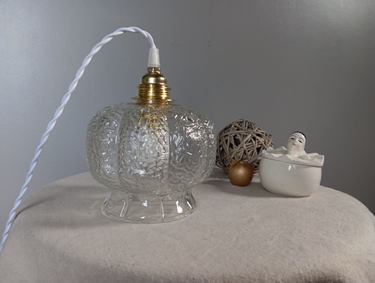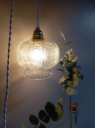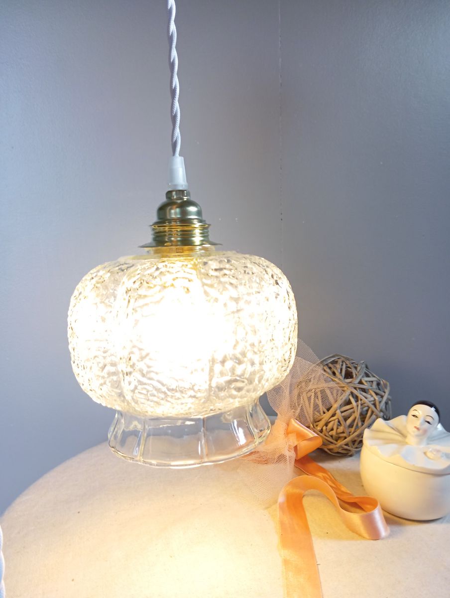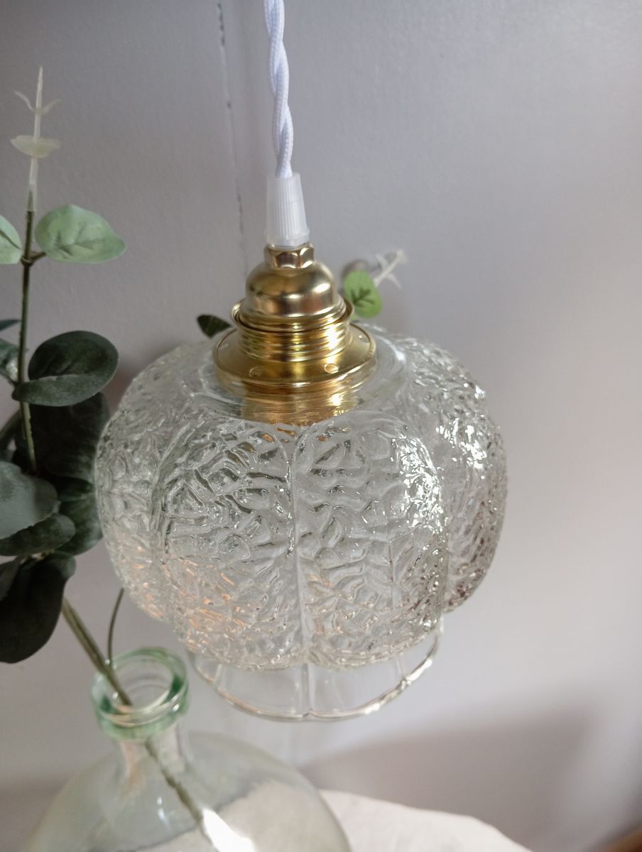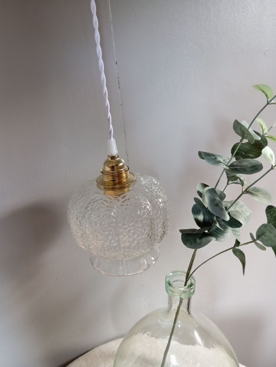 Coup de cœur pour ce globe en verre ciselé transparent issu d'un ancien lustre, déniché dans une brocante. Je l'ai restaurée en baladeuse avec un cordon tressé blanc pour donner un style contemporain à l'ensemble. Jolie forme légère et délicate, vous pourrez la suspendre ou la poser dans toutes vos pièces de vie, dans votre entrée, votre chambre et encore votre bureau.