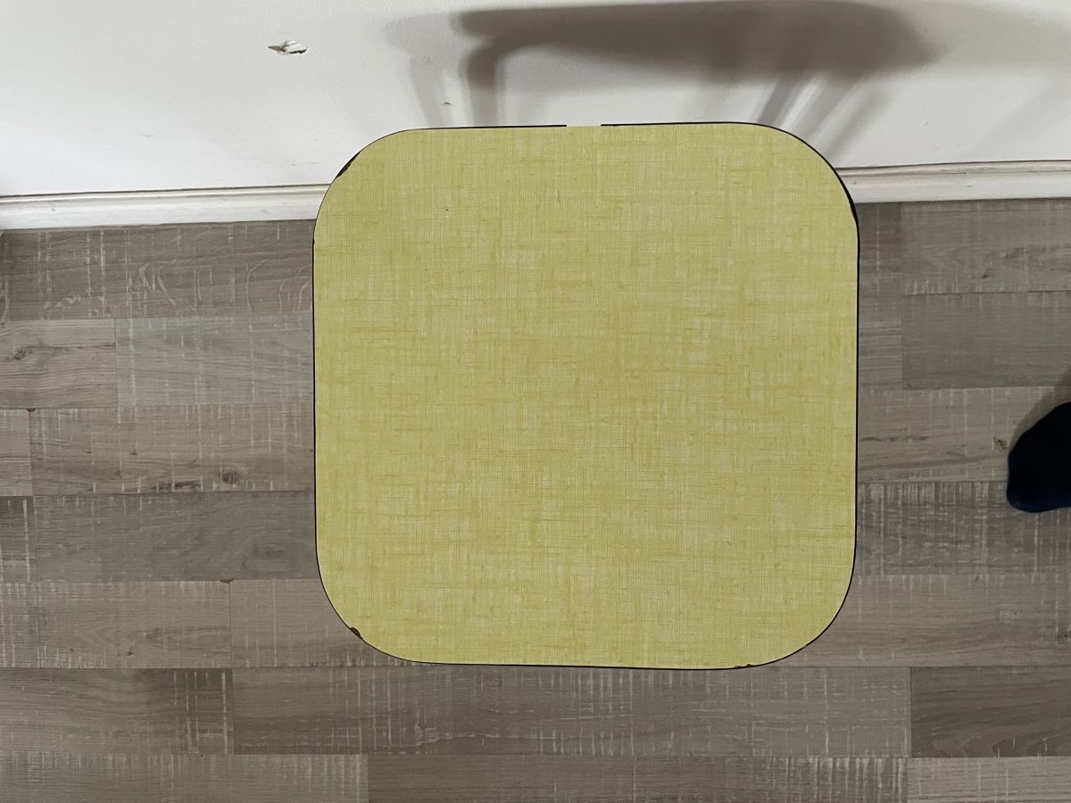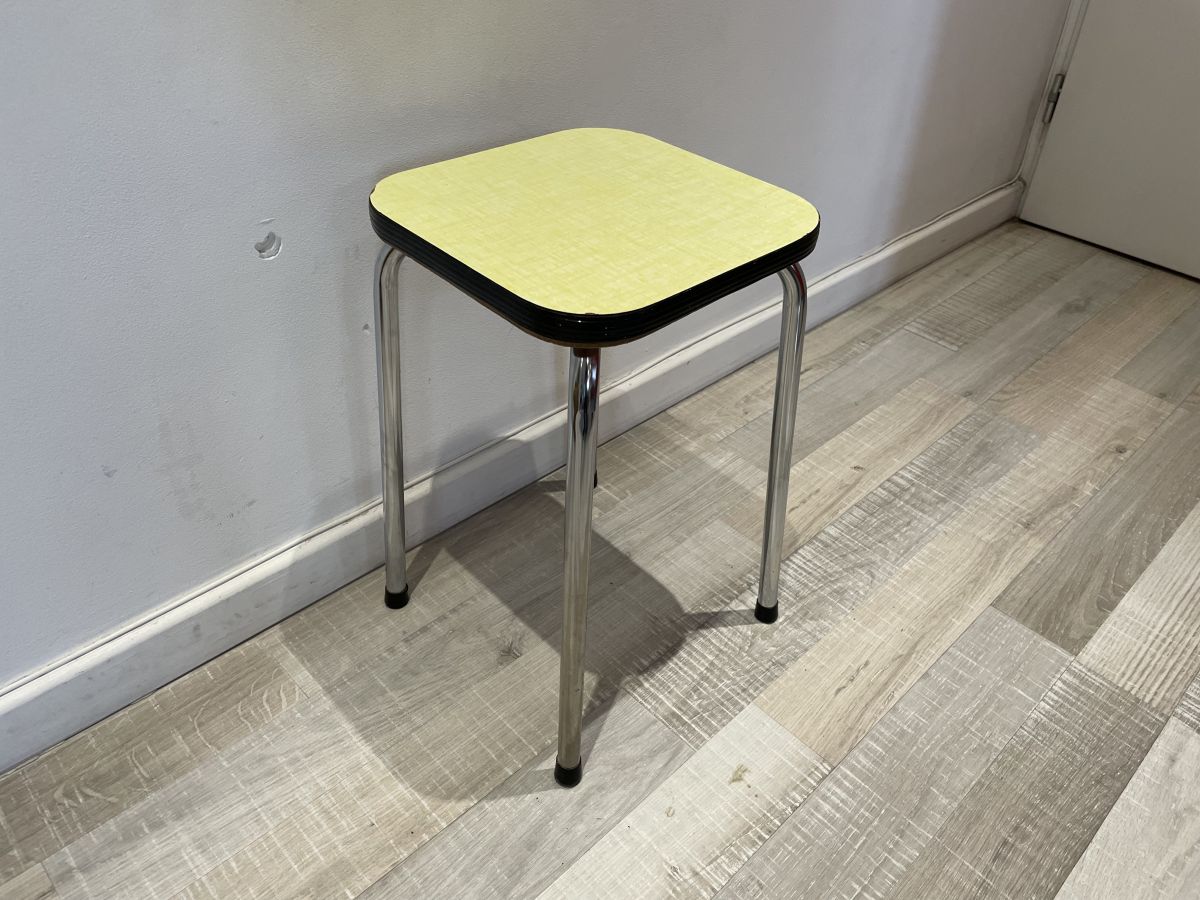 Tabouret en formica jaune des années 60, quelques traces d’usage et légers éclats sans conséquence (voir photos), fabrication artisanale française, estampillé en dessous (meubles Desher à Bourg-en-Bresse), hauteur 45cm, assise 28X28cm, bon état.