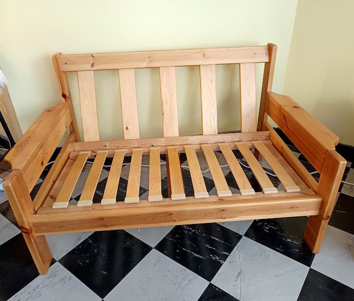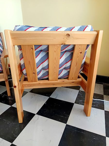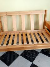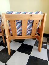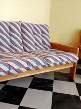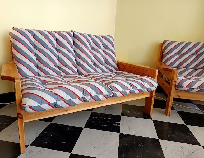 Ensemble salon vintage comprenant un canapé deux places et un fauteuil en pin datant des années 1970. Structure en pin massif aux lignes épurées.