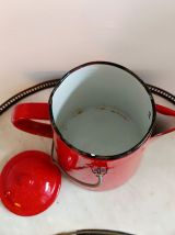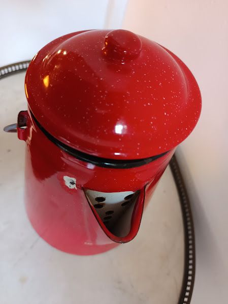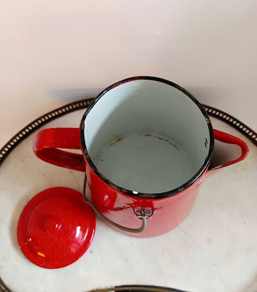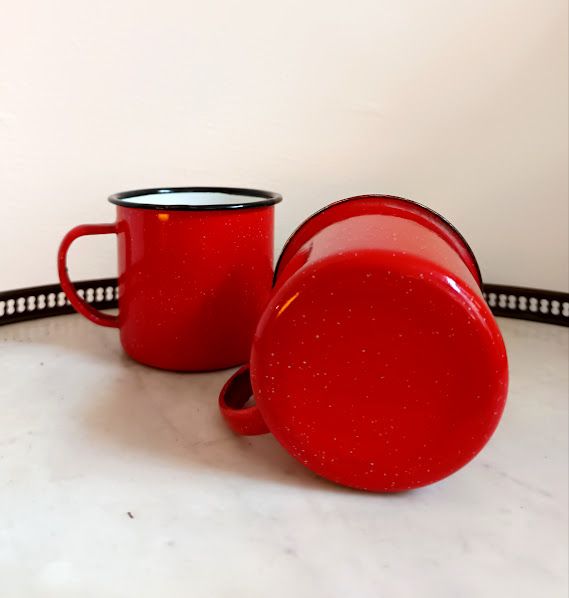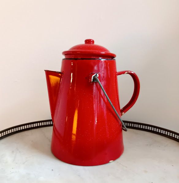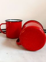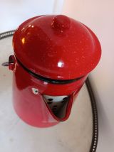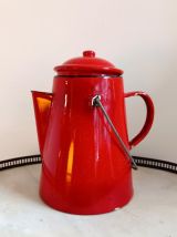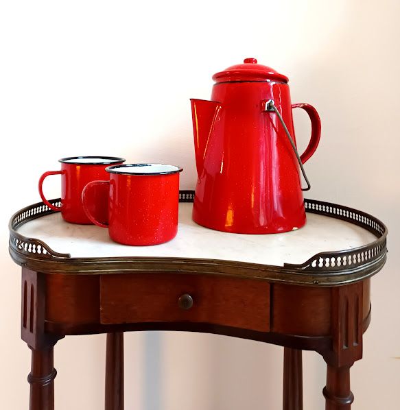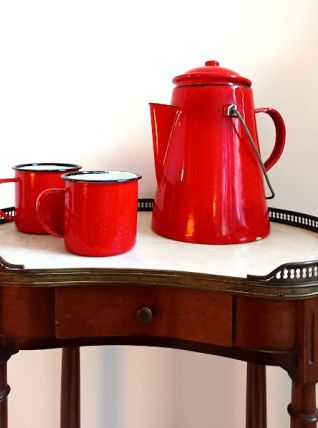 Set cafetière et tasses en tôle émaillée rouge vintage