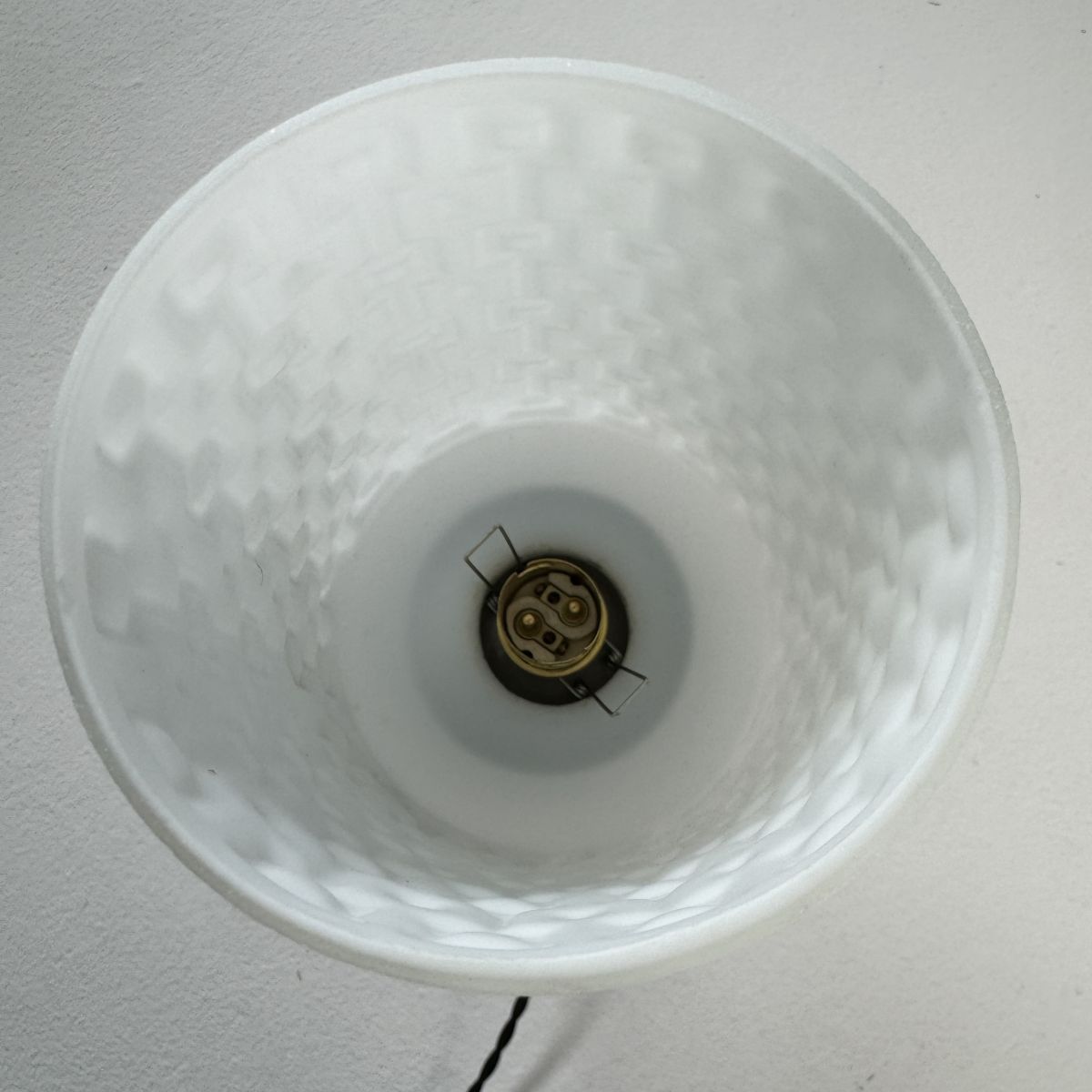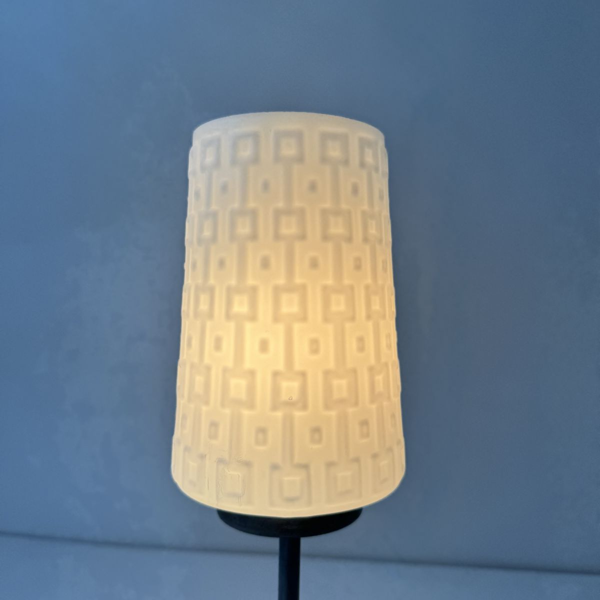 Petite lampe à poser en métal et son bel abat-jour en relief. Bon état général et belle lumière douce.
