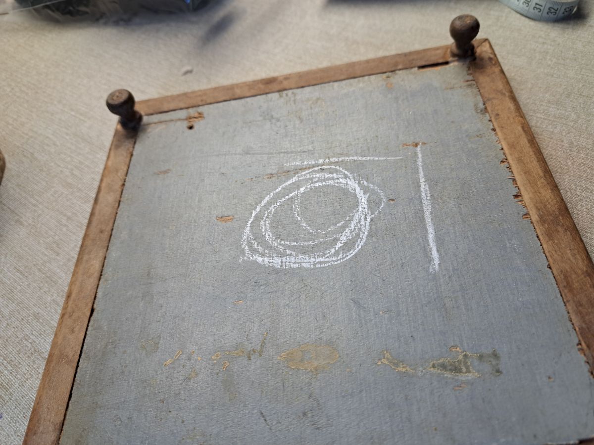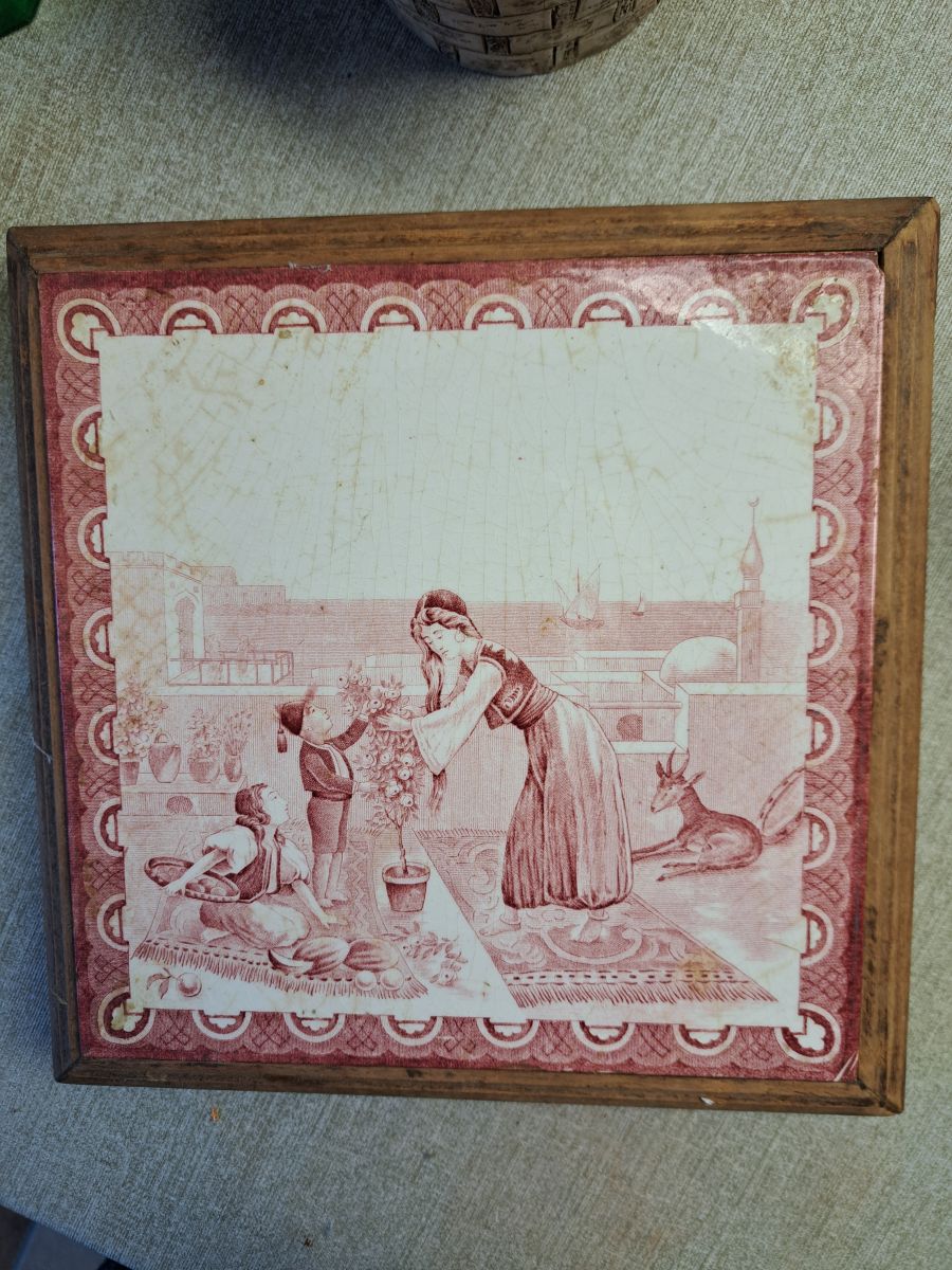Dessous de plat ancien, carreau de faïence inséré dans un cadre en bois, 4 petits pieds en bois tourné.